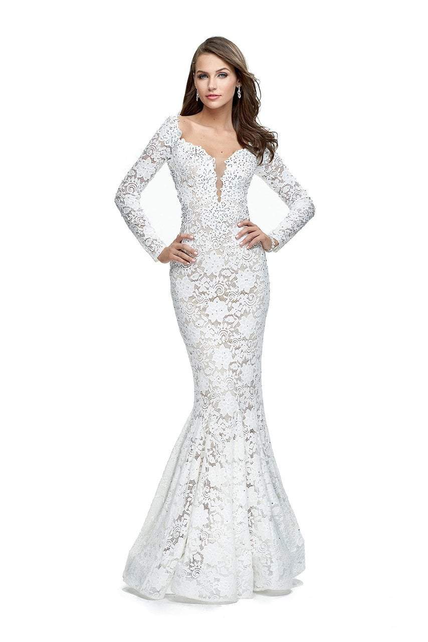 Sophisticated and statuesque, this sumptuous La Femme 25607 style for evening matches your elegant persona. This classy evening dress features a fitted bodice with plunging sweetheart neckline accented with sheer inset detail at the bust and slender long sleeves. Lace fabric graced this dress and flares from the knee to the floor emphasizing a mermaid silhouette. The back highlights a cut out detail adding sexiness to the whole ensemble. Walk the red carpet in style wearing this glamorous La Femme evening dress.