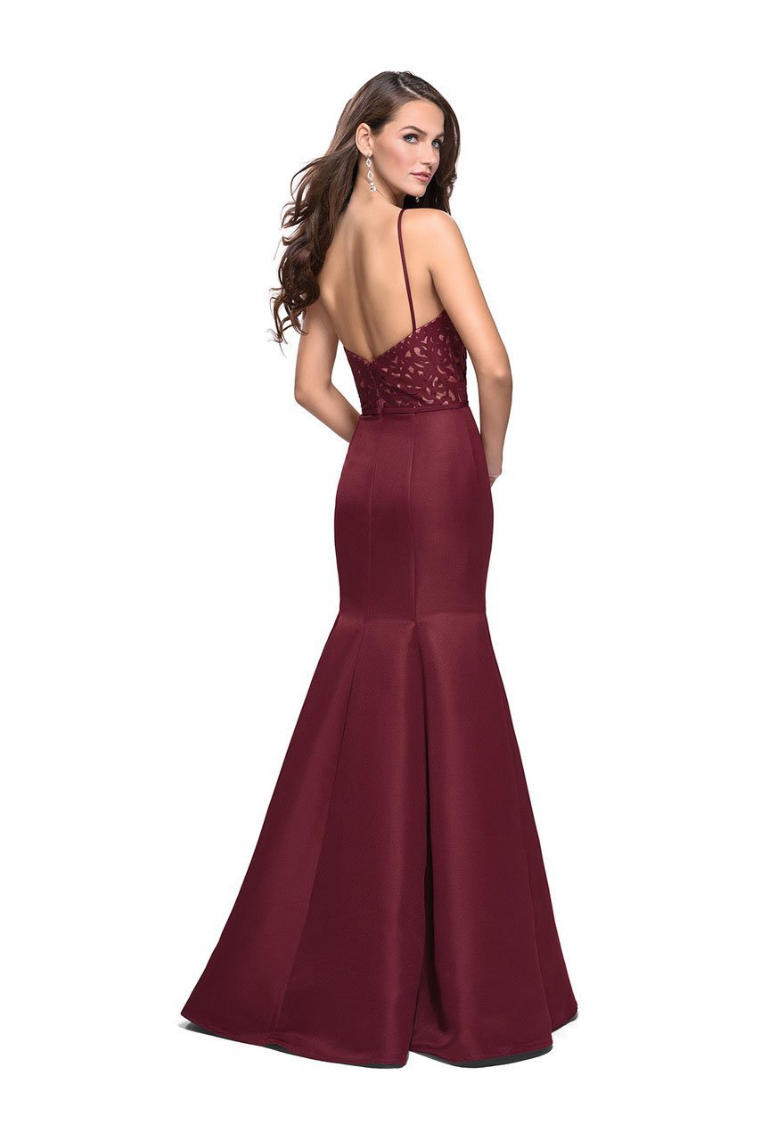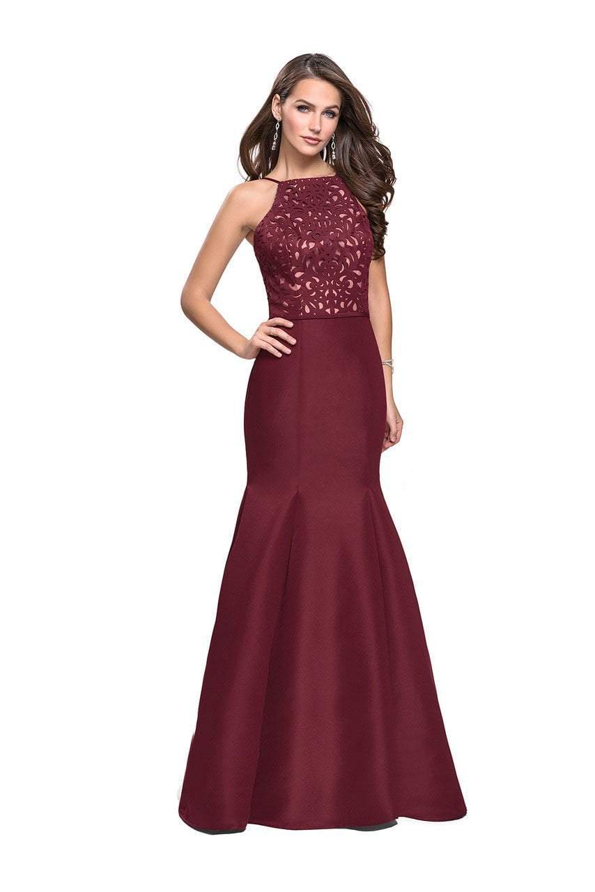 Wow everyone in this sophisticated dress by La Femme 25650. Brandishes in a sleeveless, halter neckline with bodice detailed with laser cut patterns over a nude underlay. The back reveals mid-open and has a back zipper closure. The skirt slims through the thighs and dramatically flares at the bottom. Look timeless in a long ensemble by La Femme.