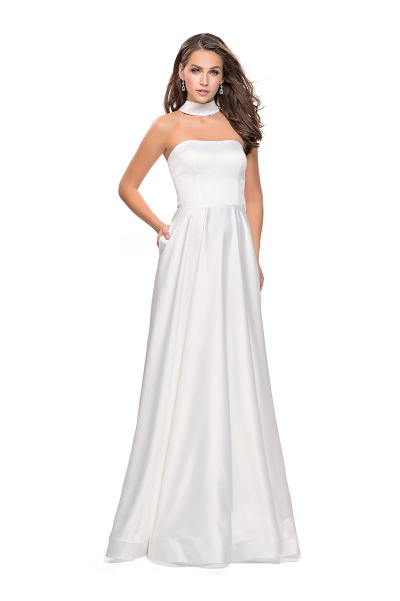 Look like a brilliant beacon under a midnight sky in this lustrous La Femme 25680 creation. Stunningly sculpted in a luxurious satin fabric, this elegant piece showcases a strapless straight-across neckline on a fitted bodice. Designed with a sexy racerback detail that wraps to create a choker accent, wide straps radiate at the back to fashion a ladder detail and a basque cutout treatment. The rich A-line skirt dazzles in soft waves as it cascades down to a fancy full-length hemline. Make your grand entrance a memorable one as you bask in admiration in this polished La Femme masterpiece.