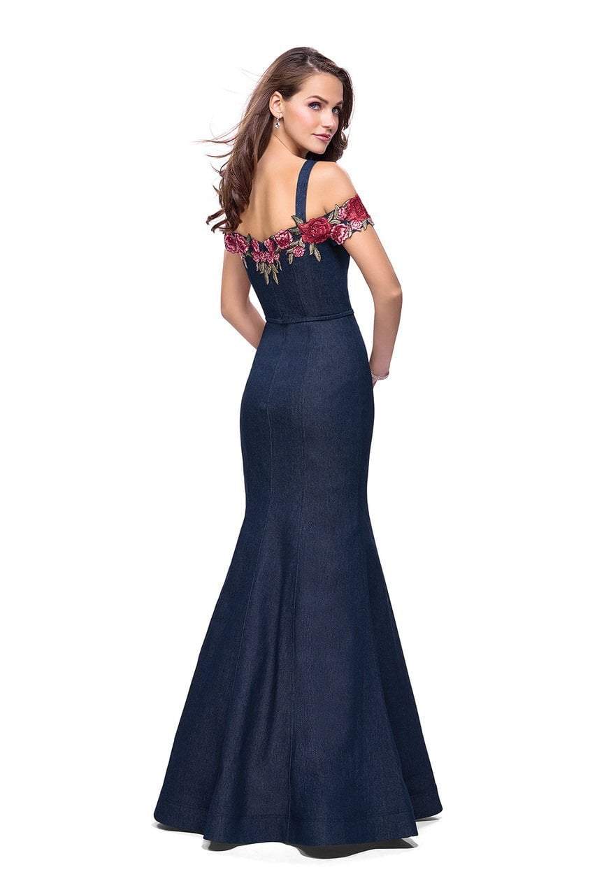 Celebrate in style wearing this modern denim long dress from La Femme 25753. The fabulous sweetheart bodice has fluttering off the shoulder straps creating a cool cold shoulder effect. Trimmed with amazing floral adornments, this trendy trumpet ensemble drapes to the full-length hem. This delightful La Femme creation will definitely make a statement.