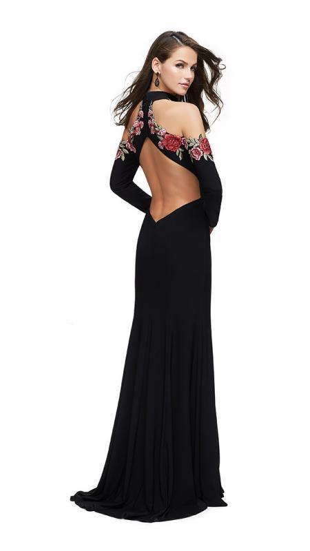 | Details: | Long sleeves, Floral appliques, Shoulder cutouts, Diamond open back, Back zipper, Sheath skirt, Slit, Sweep train |