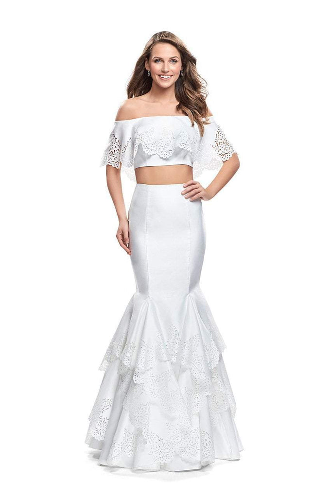 This La Femme 26193 dress has a captivating look that's sure to leave a lasting impression. Fashions a two piece set with an off the shoulder neckline crop top accented with laser cutout details. The skirt flows towards the floor in a mermaid silhouette with ruffle details and cutouts. This La Femme dress is perfect for a girl who wants the standout style and flawless fit.