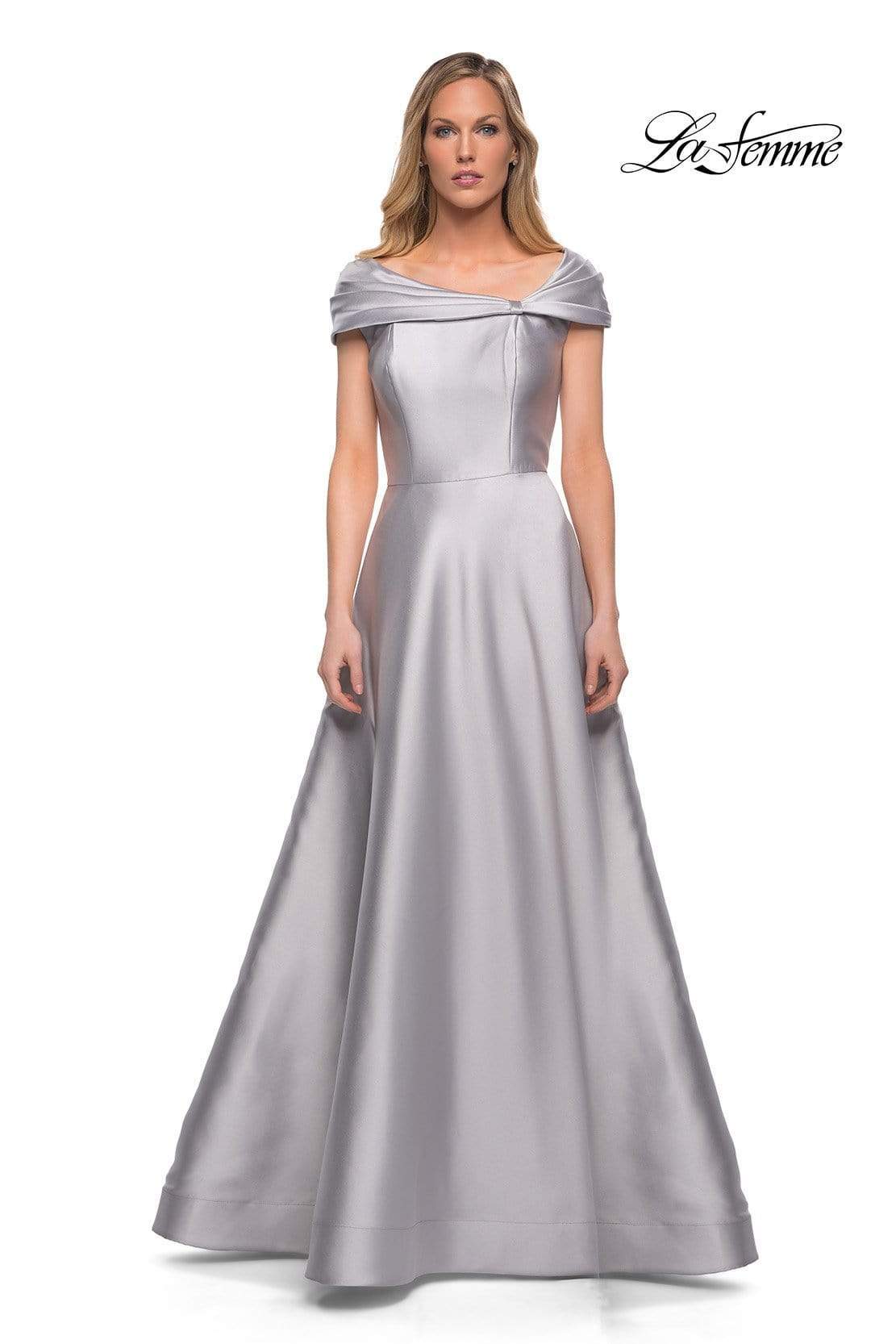 Wow everyone in this sophisticated dress by La Femme 26877. This Mikado gown appeals in a pleated asymmetric neckline with a fitted bodice tailored with a back zipper closure. The full length skirt forms an A-line silhouette and is detailed with pockets for convenience. You will definitely make a statement in every occasion with this La Femme dress. Models are wearing Navy and Platinum colors