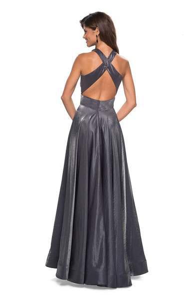 Step out in a stellar style that looks so sumptuous in this La Femme 27151 creation. Crafted in a two-toned satin fabric that creates a crisscross cutout bodice, this chic piece shows a halter neckline with fine ruching. Defined with a wide inset band and a crisscross strapped back, the A-line skirt unveils a surplice high slit before touching the floor with its full-length hem. Look like a royal gem among the opulent crowd in this La Femme masterpiece.