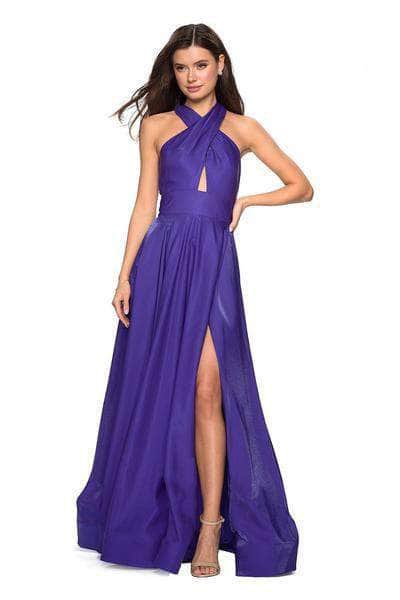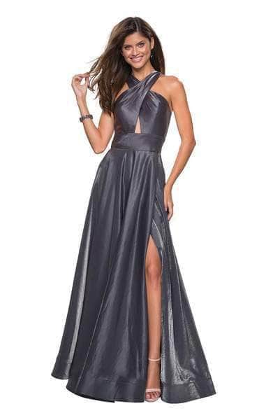 Make a grand entrance in a stellar style that exudes luxury with this La Femme 27151 creation. Fashioned from a two-toned satin fabric that forms a crisscross cutout bodice, this chic piece features a halter neckline adorned with fine ruching. The dress is defined by a wide inset band and a crisscross strapped back, while the A-line skirt reveals a surplice high slit before gracefully reaching the floor with its full-length hem. Embrace a regal presence among the opulent crowd in this masterpiece from La Femme 27151.