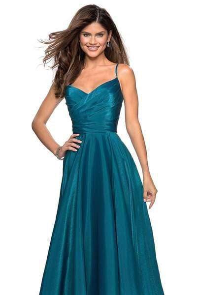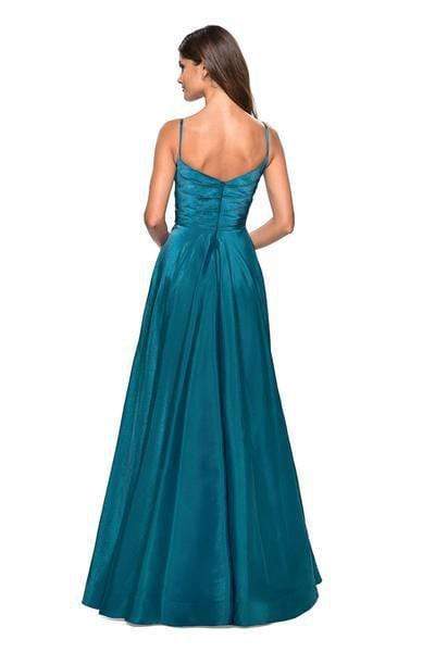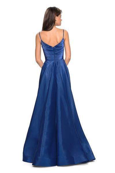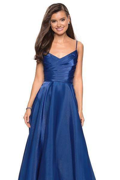 Make a memorable splash at your upscale evening in this lux formal dress by La Femme 27226. Presents in a sleeveless, pleated V-neckline with shoulder straps. The V-back has a zipper closure and the satin skirt flourishes an A-line silhouette in full length hem. Look like a siren in a melodic gown from La Femme.