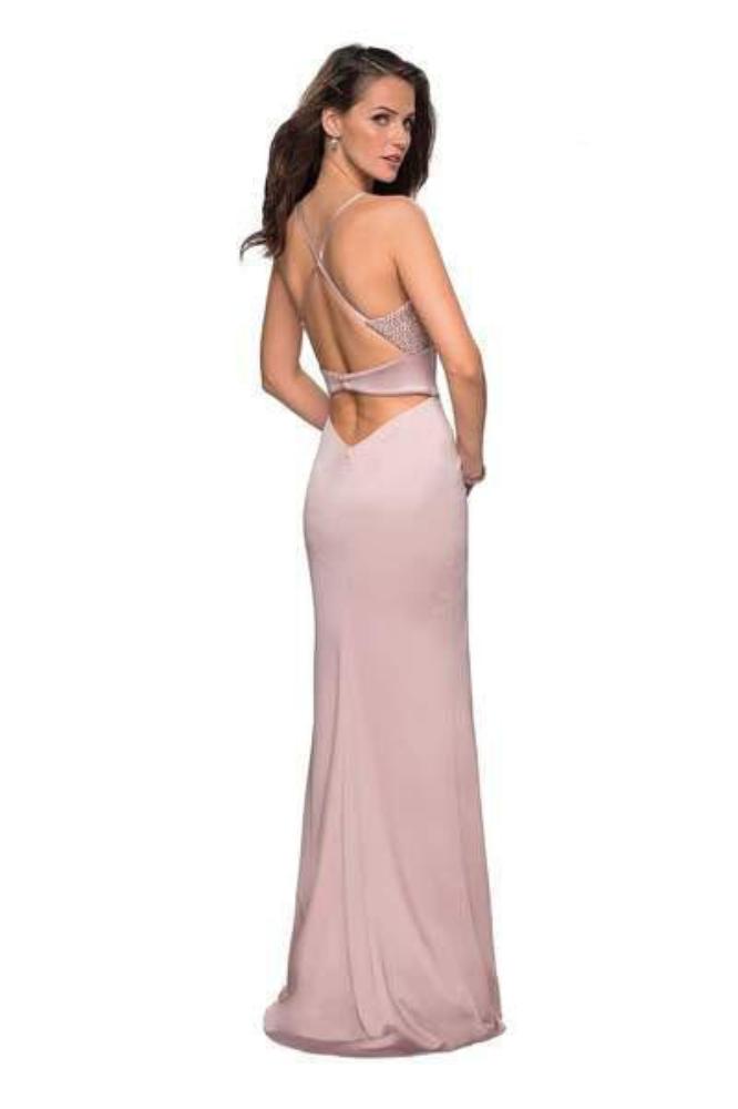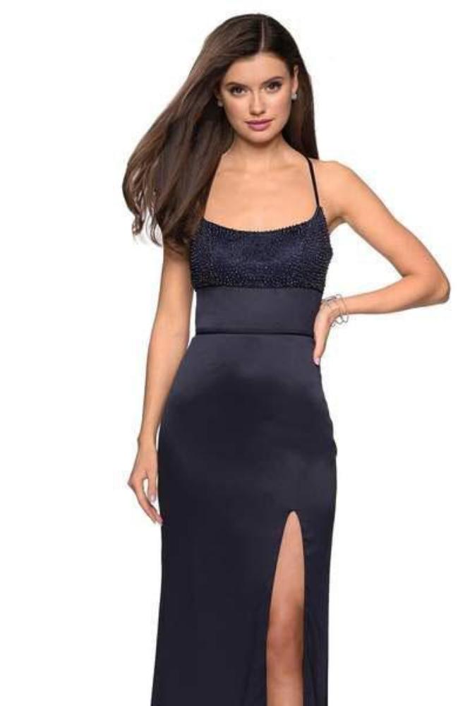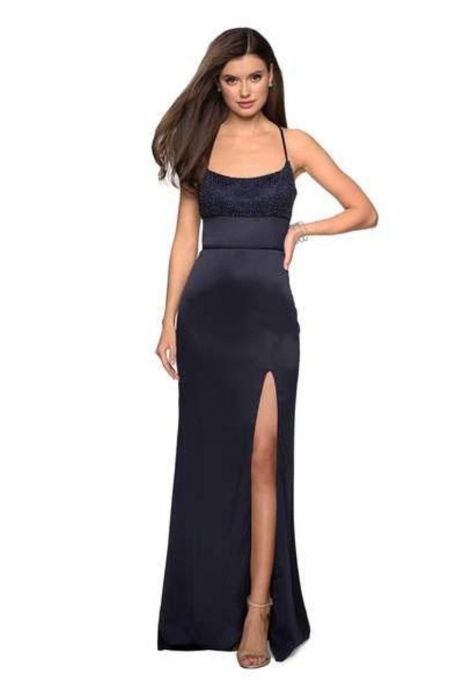 Look fabulous in this body forming long satin dress by La Femme 27274. Showcases a sleeveless, halter neckline with fitted bodice embellished with beading. The dress is styled with criss cross open back and a zipper closure. The skirt has a fitted silhouette and allures in a thigh high slit. Step out in a gorgeous dress from La Femme.