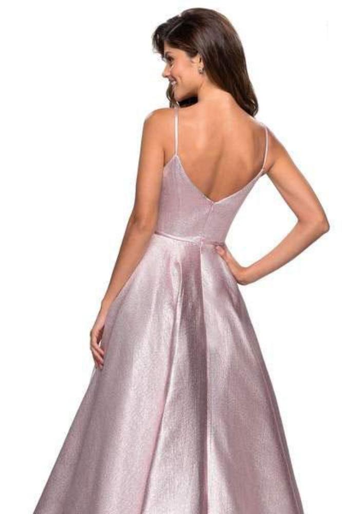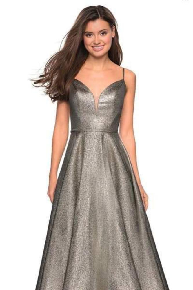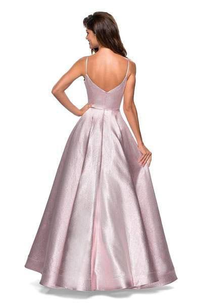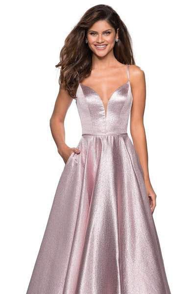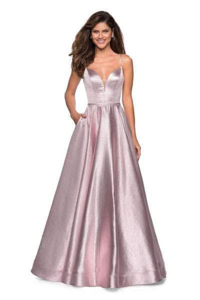 Walk in glamour and let all heads turn on you in this creation by La Femme 27322. This trendy metallic evening gown offers a fitted bodice crowned with a plunging sweetheart neckline adorned with sheer inset detail at the bust. From the thin waistband leads to the pleated ballgown skirt which ripples in pleats to full length. Step out in a gorgeous gown from La Femme design.