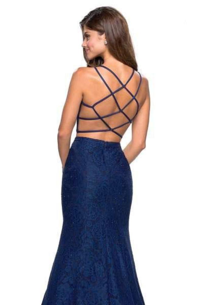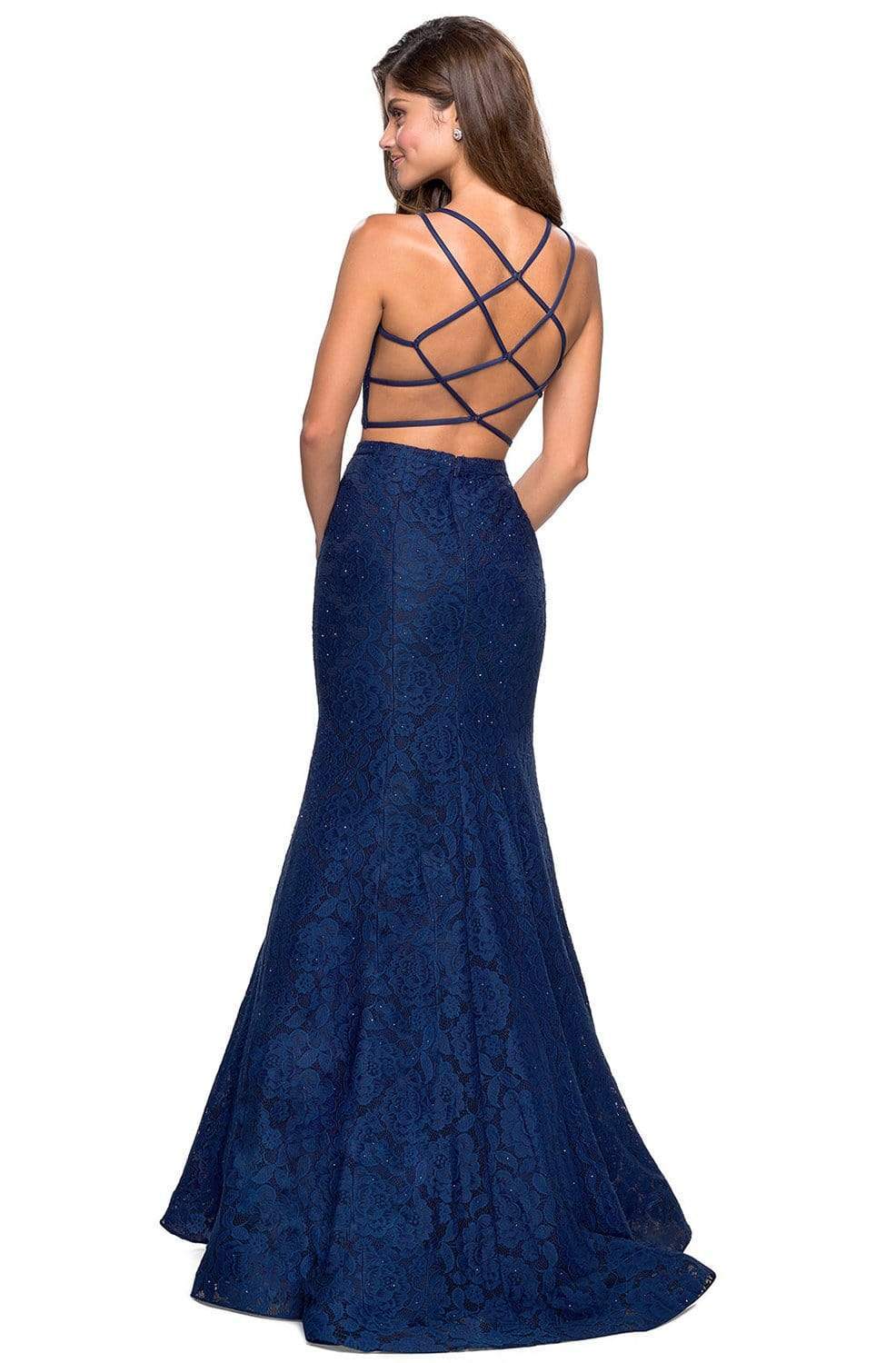 Go beyond beautiful in a precious gown from La Femme 27452 evening dress. Crafted in stretch lace, this two piece stunner features a fitted bodice crowned with a halter neckline supported by dual spaghetti straps which leads to the strappy open back. Scattered rhinestones add sparkling effect to the whole ensemble as soft pleats and dramatic sweep train create the perfect finish. This glamorous La Femme dress is sure to make a lasting impression at your upcoming social event. Find more Blue Dresses.