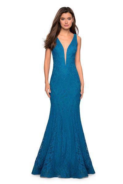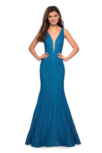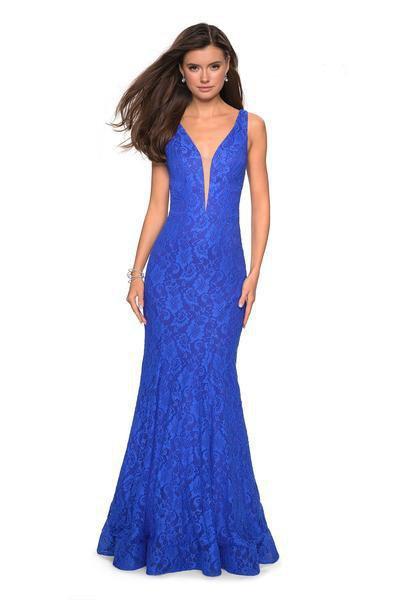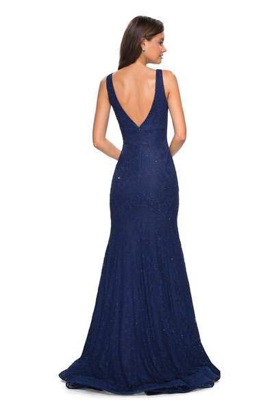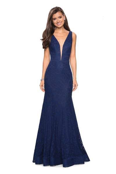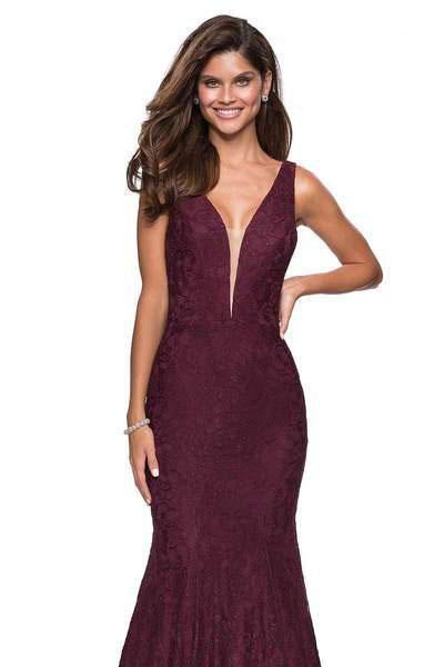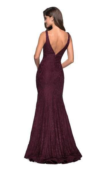 Enter the hall with grace and beauty in La Femme 27464. Shows off in a sleeveless, long stretch lace with a deep V-neckline with sheer inset. The fitted bodice has a low V-back and a zipper closure. Scattered sequins give this dress a dazzling feel. Completing the look is a full length trumpet skirt with a sweep train. Walk in seduction and style in this La Femme dress.
