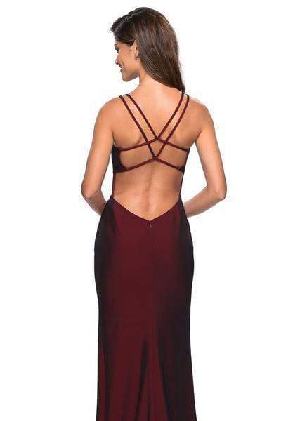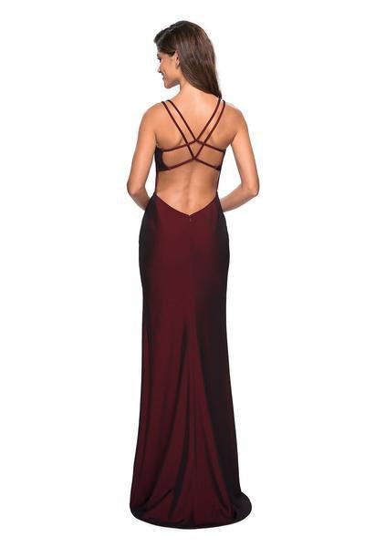 Spice up your date wearing this sexy masterpiece by Femme 27512. Coutured with tailoring seams, the fitted bodice offers a plunging sweetheart neckline adorned with sheer inset detail at the bust. Dual spaghetti straps lend support to the top as it gives way to the strappy open back. A side slit highlights the sheath skirt as it gorgeously finished with a sweep train. Create a perfect evening with this La Femme ensemble.