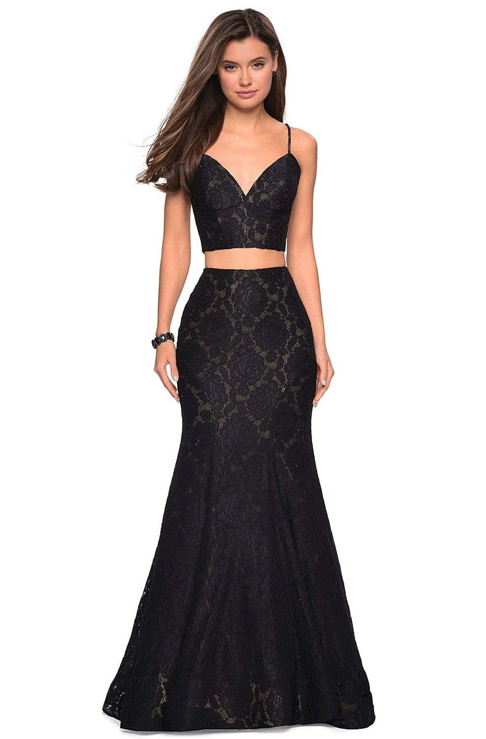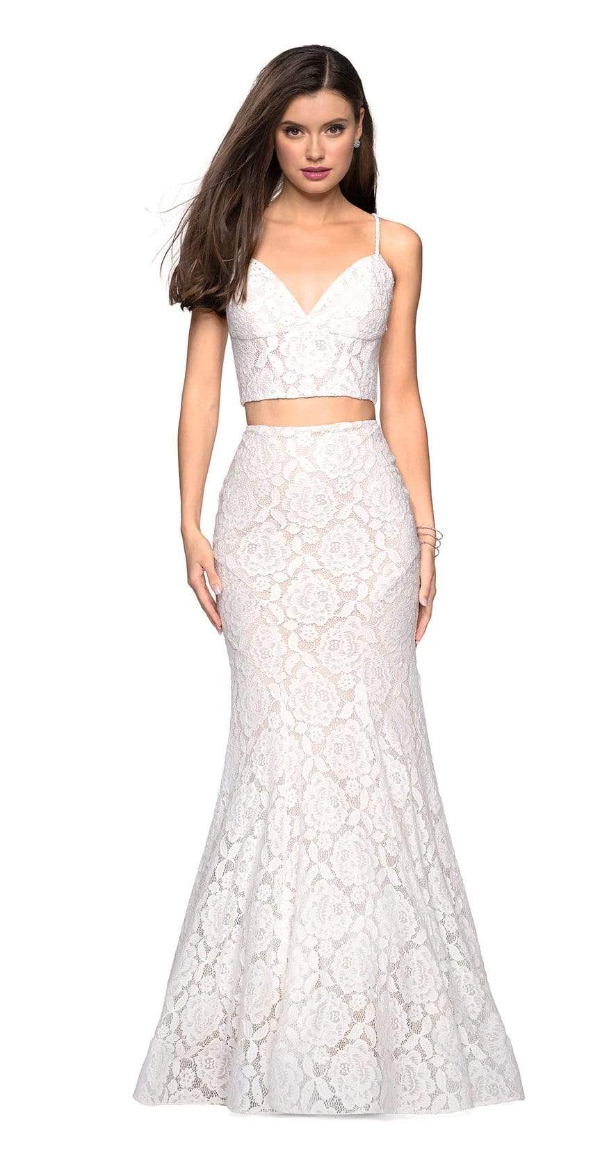You are more than gorgeous when you wear this unbeatable dress from La Femme 27589. This two piece dress stuns in a sleeveless, sweetheart neckline crop top. Made of lace and stretch jersey fabric. The skirt has a mermaid silhouette and runs at full length hem. Turn heads instantly when you wear this La Femme dress.