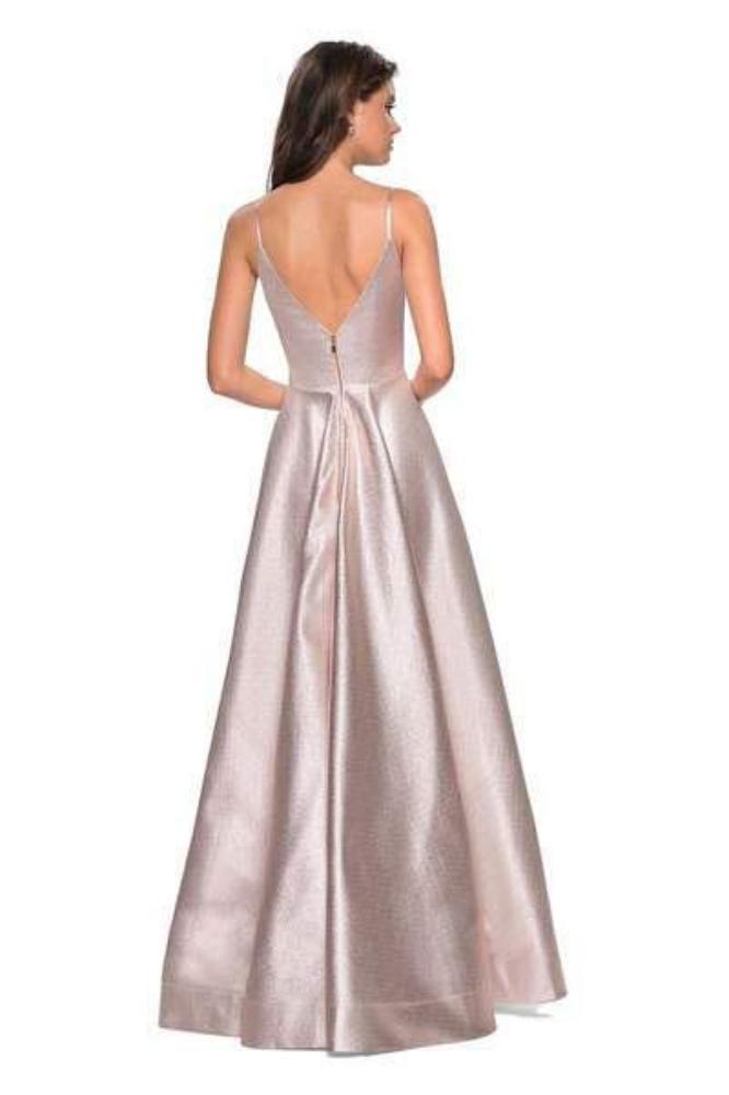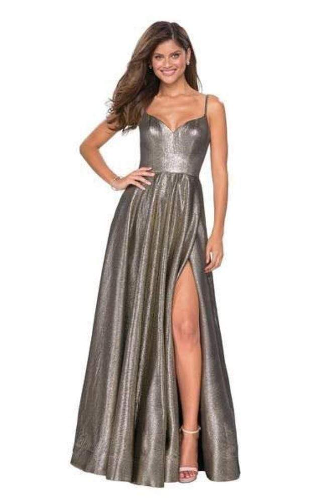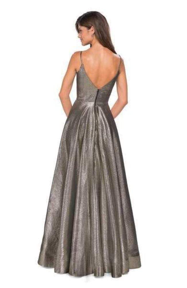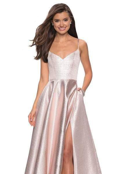 Reveal a style that would rival that of the celebrities in this La Femme 27619 creation. Fascinatingly crafted with tailoring lines along a metallic fabric, this exceptional piece shows a curving v-neckline supported with spaghetti straps. Converging into a deep v-open back, the A-line skirt parts with a sexy high slit before cascading down into a full-length hemline. Create interest among the fascinated crowd with your glorious La Femme masterpiece.