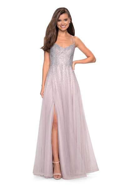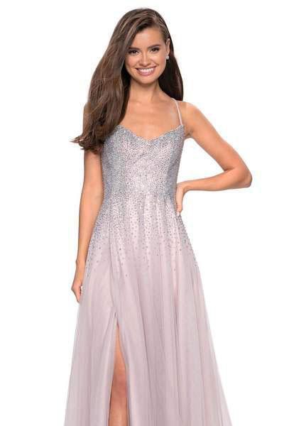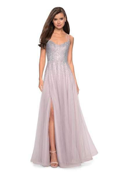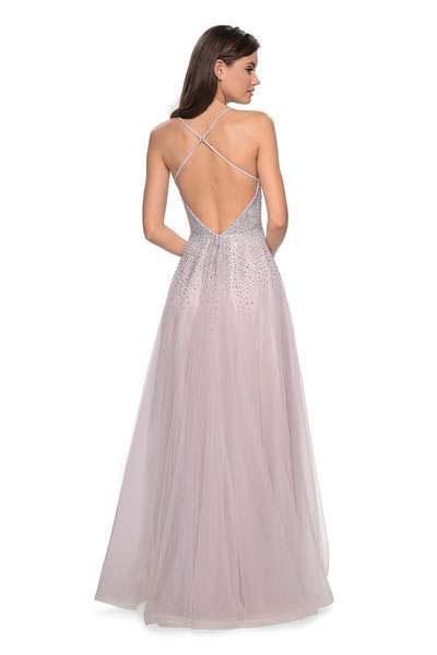 Wow everyone in this sophisticated dress by La Femme 27750. This sleeveless dress charms in a V-neckline with fitted bodice styled with a strappy open back. This bodice is beautifully ornate with rhinestones while the back has a zipper closure. The full length skirt opens in an A-line silhouette and is designed with pockets for convenience. Portray the rich variety in design of this dress by La Femme.