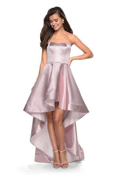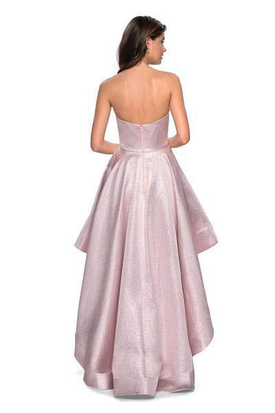 Look fresh and pretty in this creation by La Femme 27783. Made of metallic fabric, this strapless dress has a sweetheart neckline with fitted bodice styled with a back zipper closure. The high low skirt flares an A-line silhouette and is accented with pockets and sweep train finish. Be strikingly gorgeous in La Femme.
