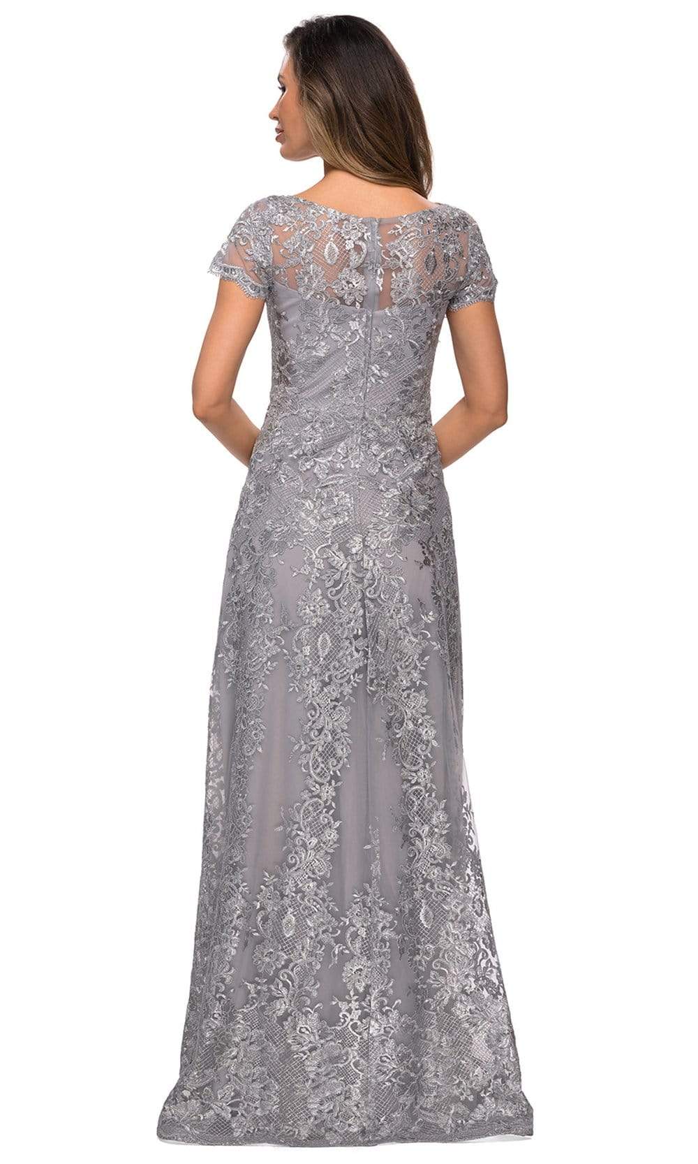 Charm everyone with the intricate beauty of this floor-length lace formal dress by La Femme 27935. This beautiful piece is exquisitely crafted with a lattice pattern and floral lace with glimmering rhinestone beadwork on its mesh overlay, as it defines an illusion bateau neckline with dainty short sleeves and a semi-fitted lined bodice. From the natural waist, the modest A-Line skirt glides in a full length. Add a touch of elegance and grace as you mingle into that special event wearing this elegant ensemble from La Femme. Models are wearing the Mauve, Navy and Silver colors.