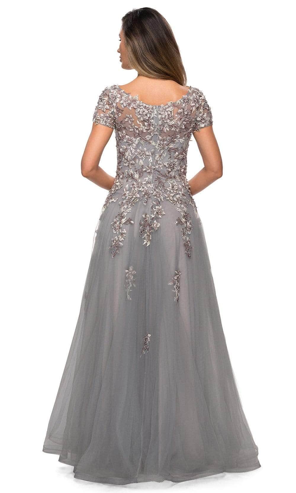 Channel red carpet glamour when you wear this Femme 27968SC creation. This tulle gown decorated with beaded and lace appliques in a floral pattern exudes a romantic and feminine appearance. Showcases are the v-neckline, short sleeves, and partial illusion scoop back fastened by the hidden zipper closure. The skirt gorgeously forms an A-line silhouette that flows to the full length and exits with a stylish thin horsehair hem. Whether you are attending a gala or a wedding, this La Femme 27968SC gown is guaranteed to leave a lasting impression. Model is wearing Gray color.