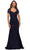Elegant full-length satin gown especially fitting the Mother of the Bride showcasing a sweetheart neckline, faux wrap bodice, sheer short sleeves, and an enclosed back with zipper. The bodice is adorned with beautiful lace applique detail, while ruching highlights the form fitting bodice. The gown is finished with a trumpet silhouette skirt with a subtle train.