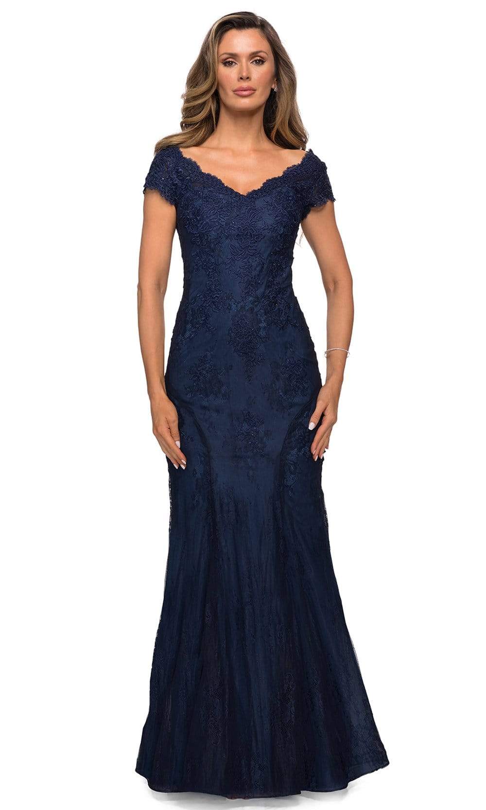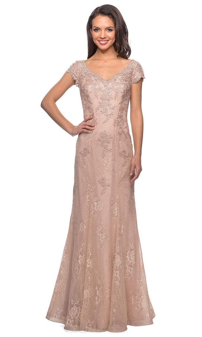 Elegance is no match to this beautiful La Femme 28099 evening dress. This full-length floral lace ensemble glitters with scattered sparkling beads as it shows a modest V neckline and cap sleeves with dainty eyelash trim. The dress is tailored with comfortable fitted bodice delicately skimming the curves down through the hips as the skirt completes a subtly flared floor length finish. Emanate regal style at your upcoming event in this La Femme creation.