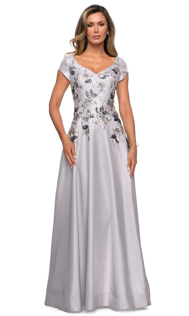 Elegance and sophistication perfectly describes this dress by La Femme 28105. Contoured with princess seams, the fitted bodice showcases a V neckline and cap sleeves strikingly embellished with floral accents. Soft pleats ripple the a-line skirt and finishes to a full length hemline. Stun everyone around with this La Femme dress.