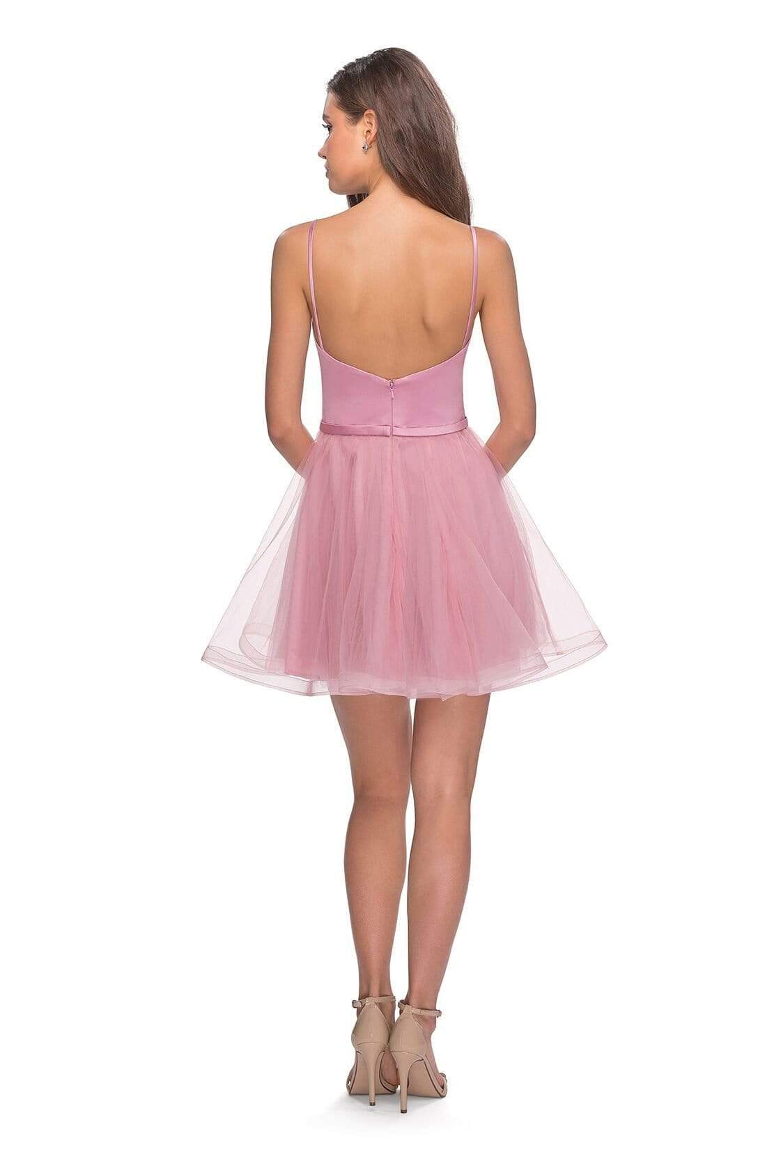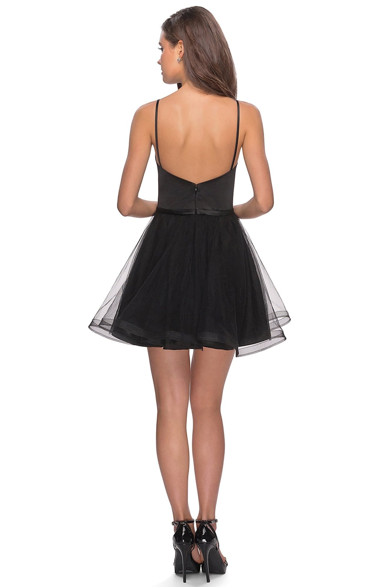 Go from day to night in a versatile dress from La Femme 28156. Delights in a sleeveless, oop neckline with spaghetti straps. The dress flaunts a mid-open back and cinches at the waist with a thin band. The tulle skirt is tailored in a mid-thigh A-line silhouette with a horsehair hemline. Orchestrate your moment to stand out in this La Femme look. Find more cocktail dresses!