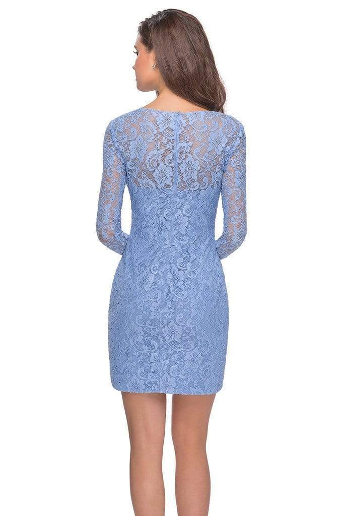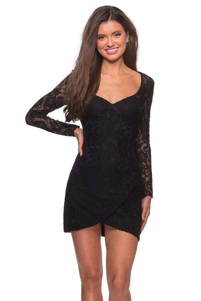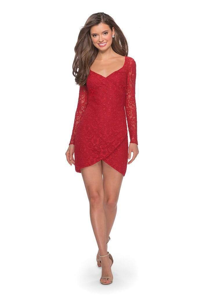 Dance the night away in this La Femme 28232 cocktail dress. Designed in all over lace fabric, rhinestones accents the faux wrap bodice with the scoop neckline and long sleeves as the end of the skirt shows a tulip style. Get the crowd's attention all night long in this La Femme 28232 elegant creation. Model is wearing Electric blue, cloud blue, black , Pale yellow and red colors.