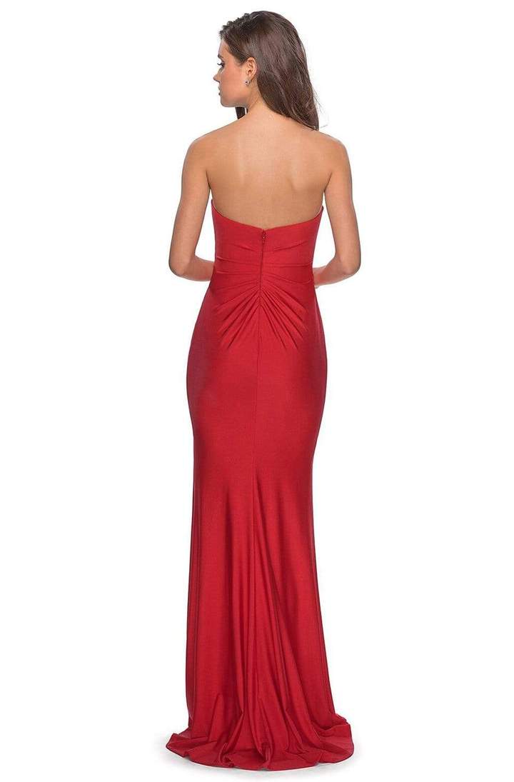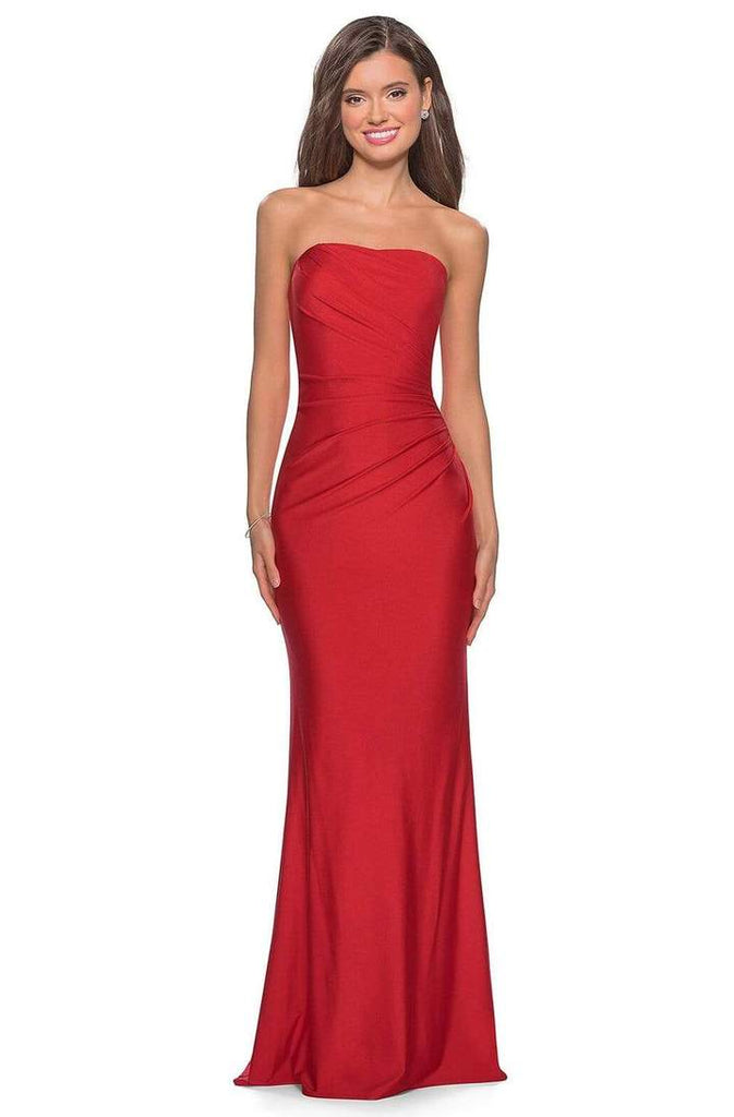 Flatter your figure with this eccentric design by La Femme 28269. Designed in a lustrous fabric accented with ruching gathering at one side, this jersey dress flatters with a strapless bodice and a modified sweetheart neckline. Subtly contoured with a shirred zipped-up back, the sheath skirt flows into a full-length hem with a train. La Femme is perfect for a standout style and flawless fit.