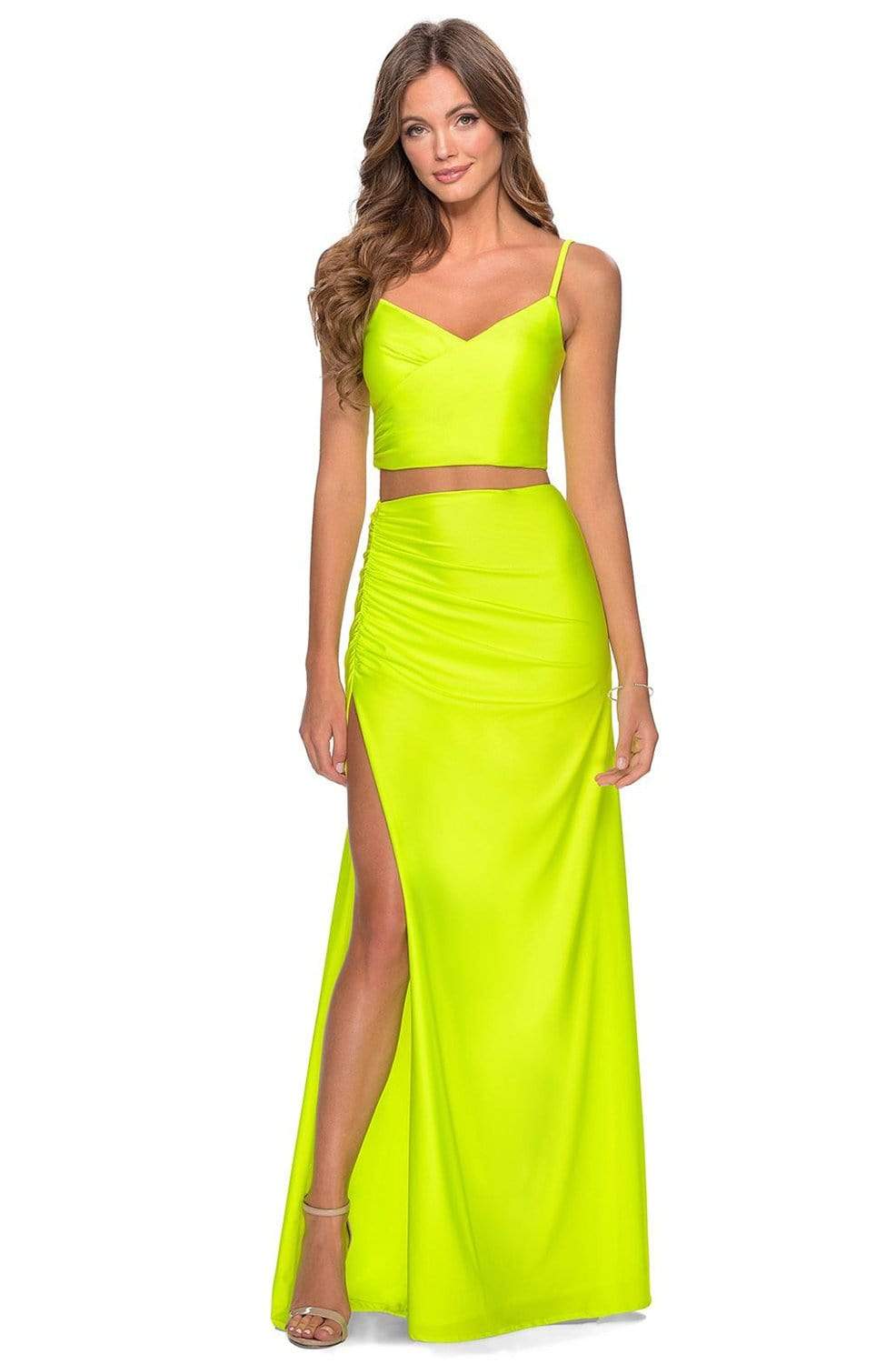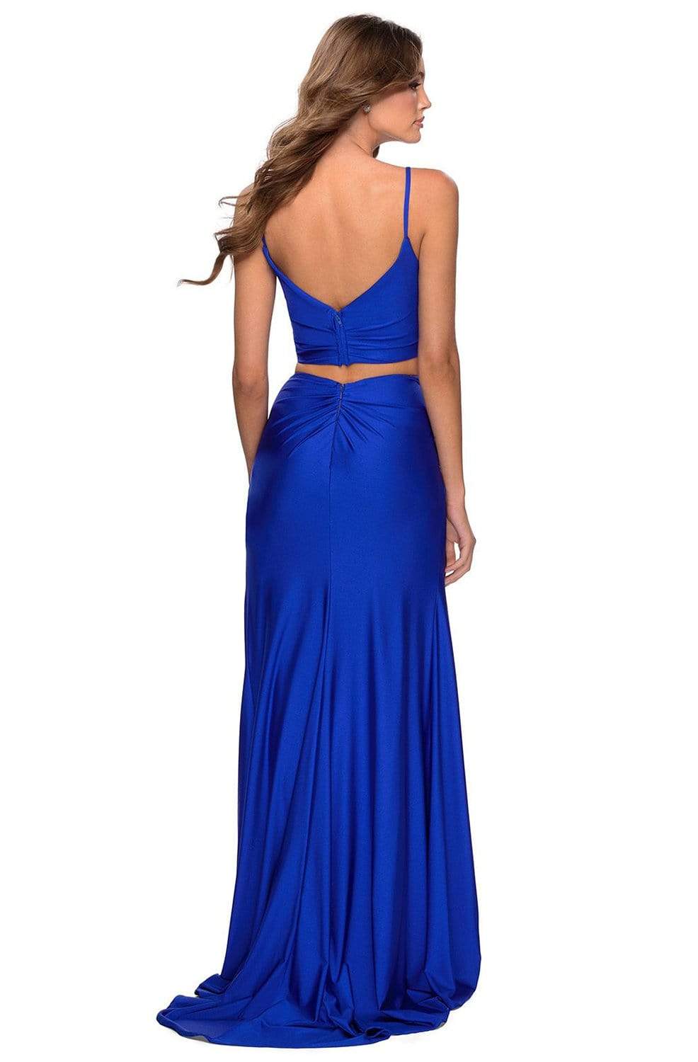 Feel the romance in the air when you arrive in this sultry La Femme 28472 creation. Featuring fine ruching on a surplice bodice, this cropped top flaunts a deep v-neckline with spaghetti straps and a scoop open back. Gathering at one side while parting with a side slit, the sheath skirt tailors into a full-length hemline with a train. Look and feel like a million bucks in this La Femme masterpiece.
