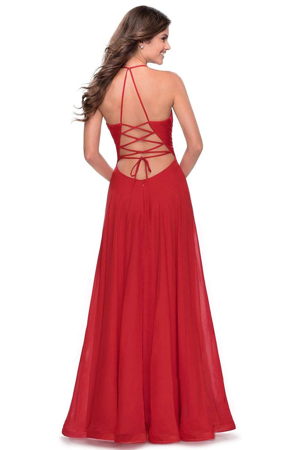 Be right on trend with this fabulous evening prom dress from La Femme 28522. This chiffon gown showcases a ruched bodice with halter straps neckline which lead to the crisscross open back. Soft pleats flow to the a-line skirt accented with a side slit for ease of movement. This La Femme creation is simply captivating! Model is wearing Red color.