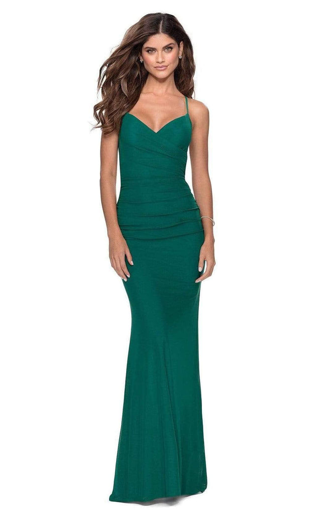 Turn yourself into a timeless beauty in this chic La Femme 28541 creation. Softly highlighted with fine ruching down its length, this fitted dress features a deep v-neckline on a surplice bodice. Thin straps support the bodice as the plunging ruched detailed back is accented with crisscrossing tie back. The slim-fitted skirt is crafted with tucks as it drops into a full-length hem and train. Bewitch everyone with your elegance in this La Femme masterpiece. Models are wearing the Emerald, Navy and Pale Yellow colors.