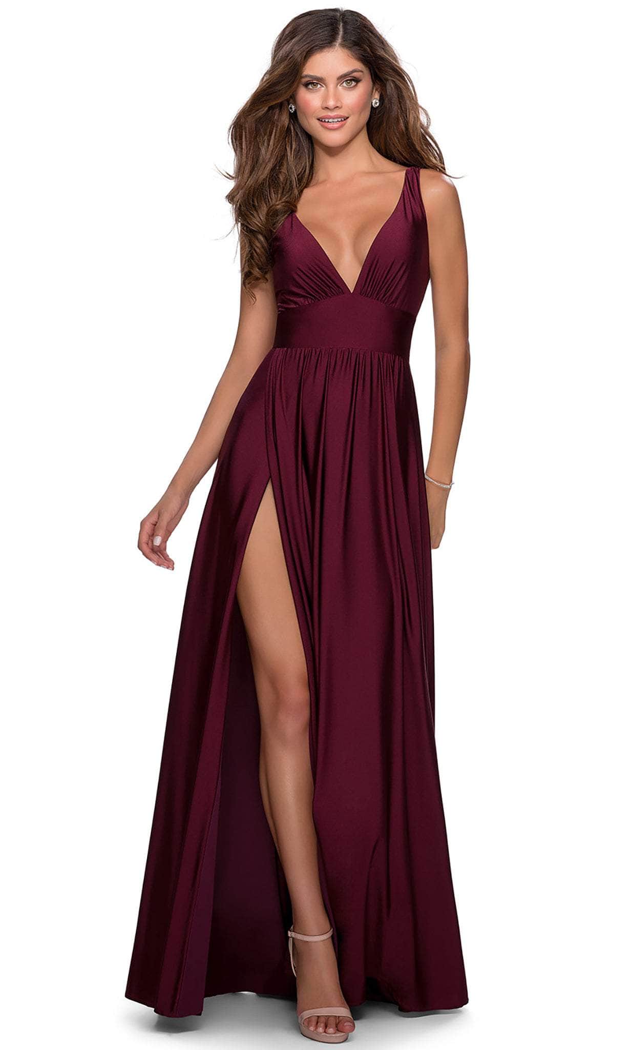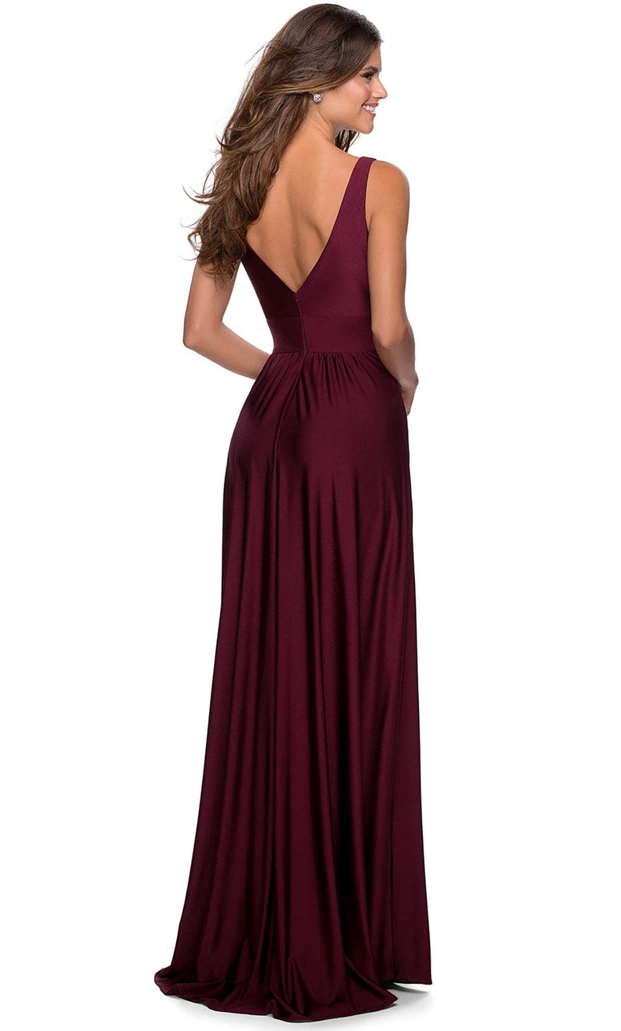 Bring out that hidden Goddess in you wearing La Femme 28547 Evening dress. Elegant in vibrant jersey fabric, this classy ensemble boasts a sleeveless bodice with deep V neckline and back with wide self-fabric band that encloses the fitted midriff. The full-length A-line skirt opens up with a right leg slit for that added allure. Get ready to parade with grace and beauty in this sophisticated La Femme creation.