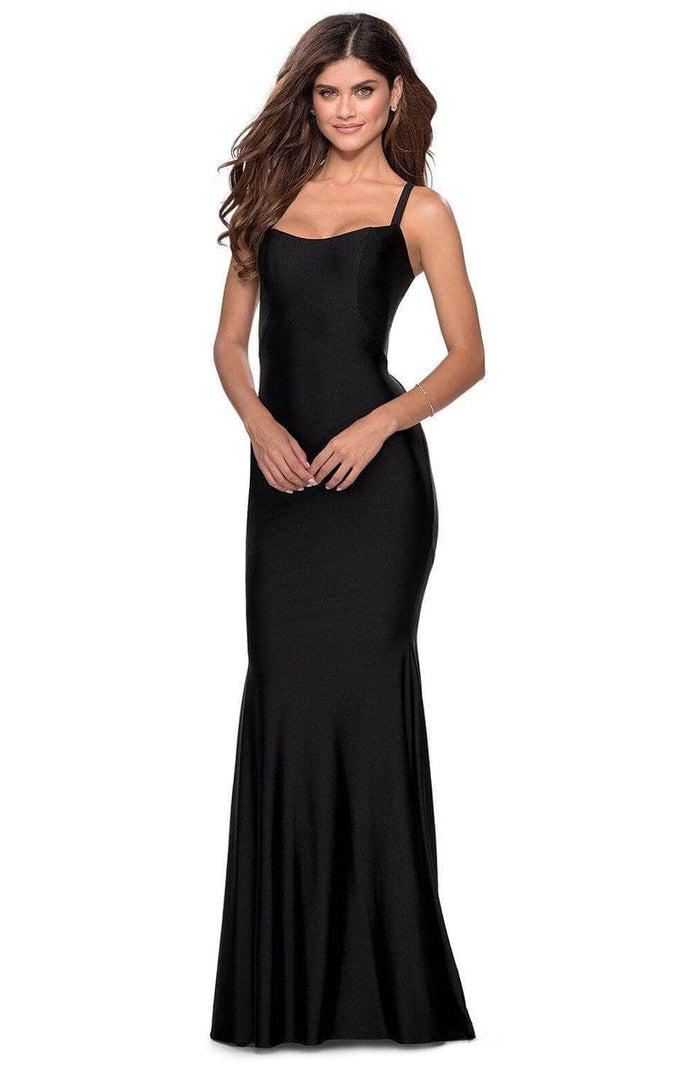 Be tailored to perfection in this dress by La Femme 28568SC. This ultra flattering jersey dress features a sleeveless, scoop neckline with thin straps. The fitted bodice is styled with a strappy back and has a zipper closure. The skirt forms a fit and flare silhouette and brings drama with a sweep train finish. Fancy a romantic night of celebration in this sophisticated dress by La Femme. Models are wearing the Black, Burgundy, Emerald, Royal Blue and Royal Purple colors.