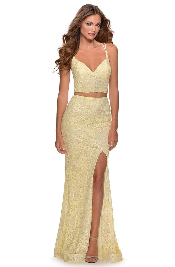 Show off your trendsetting style with this lace dress from La Femme 28590. This two piece ensemble features a sleeveless, plunging V-neckline with spaghetti straps. The crop top is designed in a corset bodice with criss cross straps. The skirt flatters your figure in a fitted silhouette and finishes in a sweep train. Everyone who sees you will be left speechless and giddy in this La Femme look. Model is wearing Pale Yellow color.