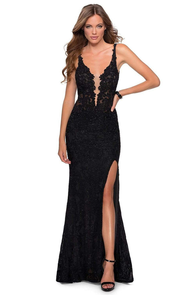 Look chic and seductive in this marvelous La Femme 28648. Tailored with a plunging V-neckline, this sleeveless stunner showcases lace and bead detailing, sheer front and side, racer back and a back zipper closure. The skirt flourishes in a sheath silhouette, ending in a sweep train. Simplicity and elegance as defined by La Femme. Model is wearing Black color.