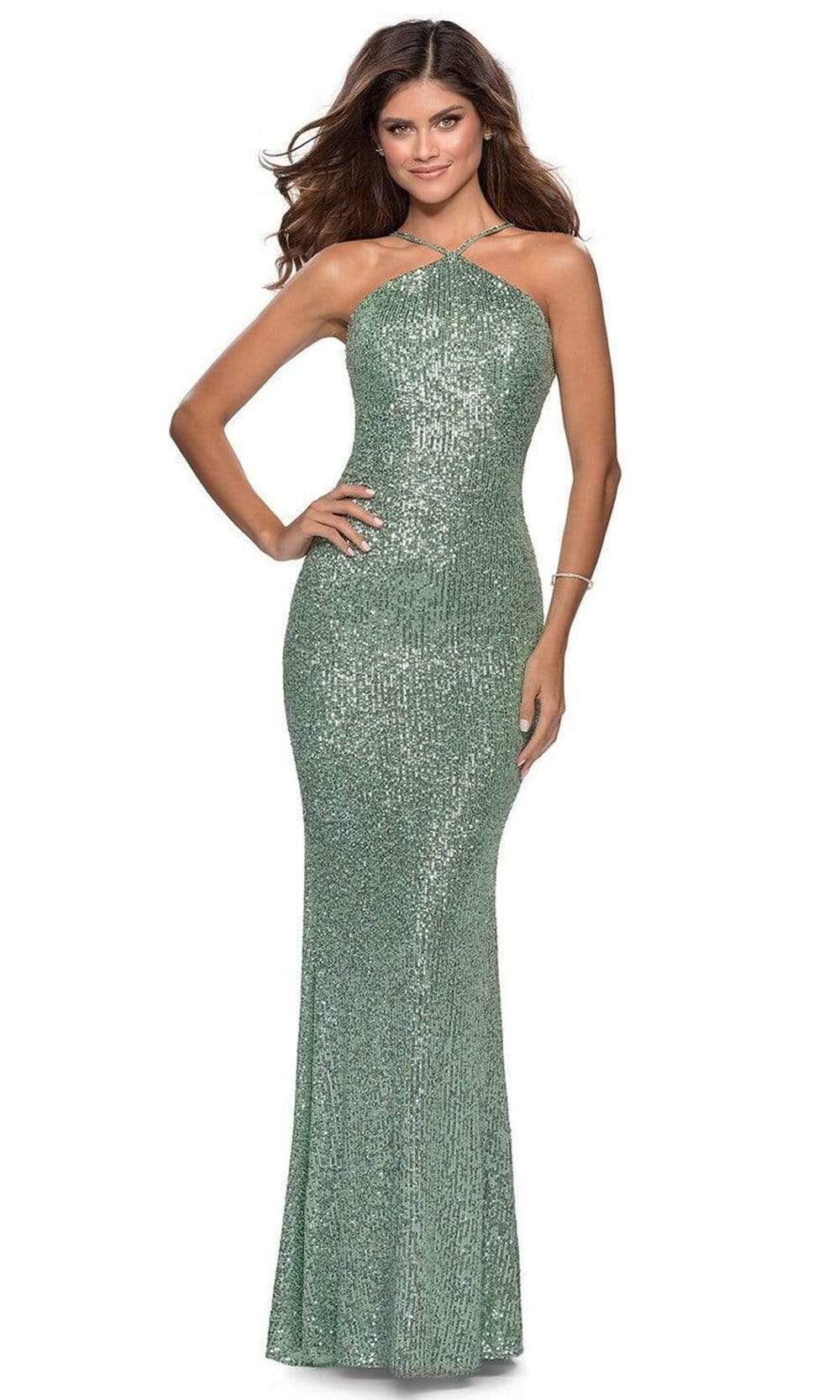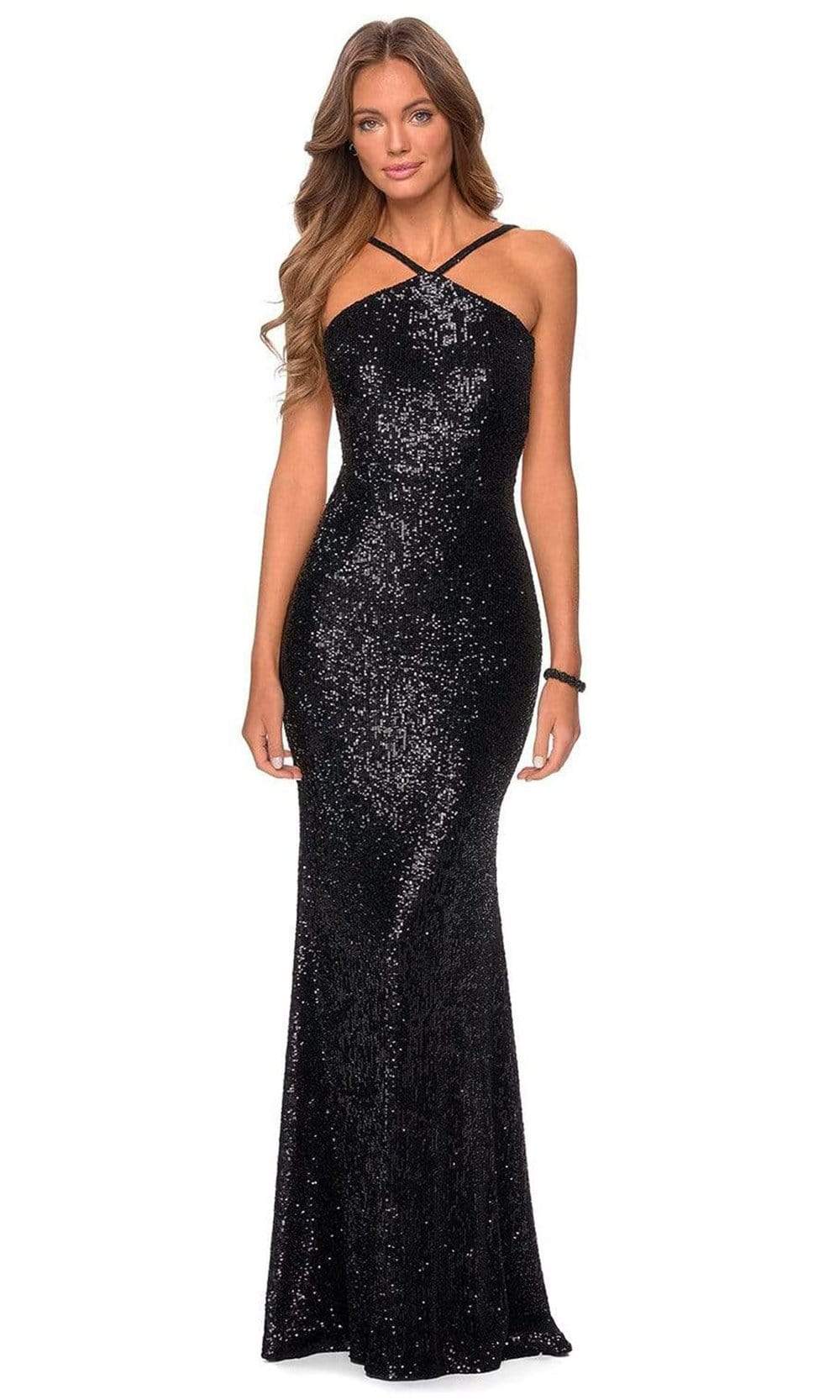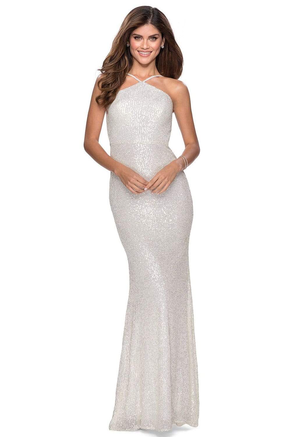 Inspire everyone to bestow appreciative glances and lingering stares when you walk in in this La Femme 28650 evening gown. This elegant style features a refined high scoop neckline with fine shoulder straps while the alluring open back reveals a spectacle of your radiant skin. Made in a lavish sequin embellished fabric sculpted to define your figure, this remarkable gown features a stunning sheath design follows through a fitted bodice and hip before streaming down to a lovely sweep train. This creation by La Femme is reserve for a special evening event that demands Wow factor. Find more Open Back Prom Dresses.