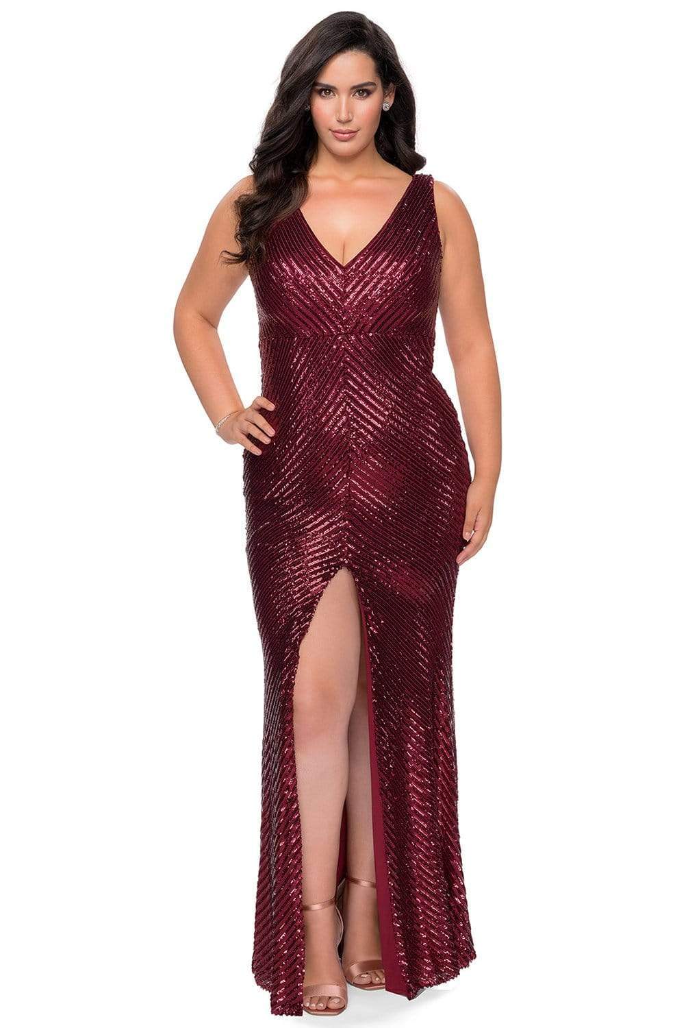 Beam with pride as you show up in this enthralling La Femme 28796 evening gown. This plus size dress is designed with all over lined sequins that hugs your curves in all the right places. A flattering V neckline crowns the fitted bodice supported with thick straps which lead to the V back. The skirt displays a sheath silhouette which graces to a full length hemline. Shimmer all night long with this La Femme dress.