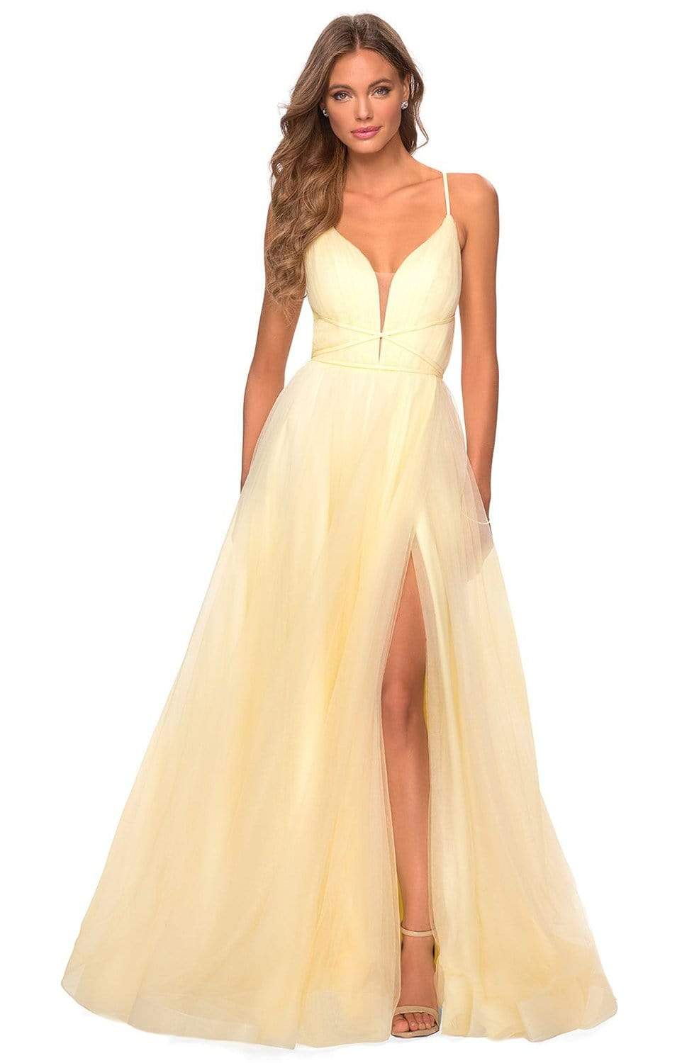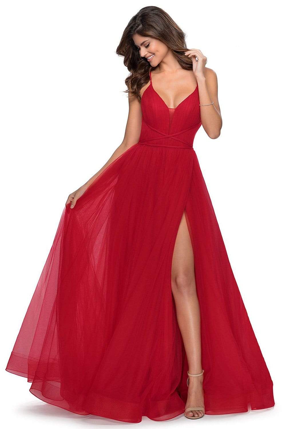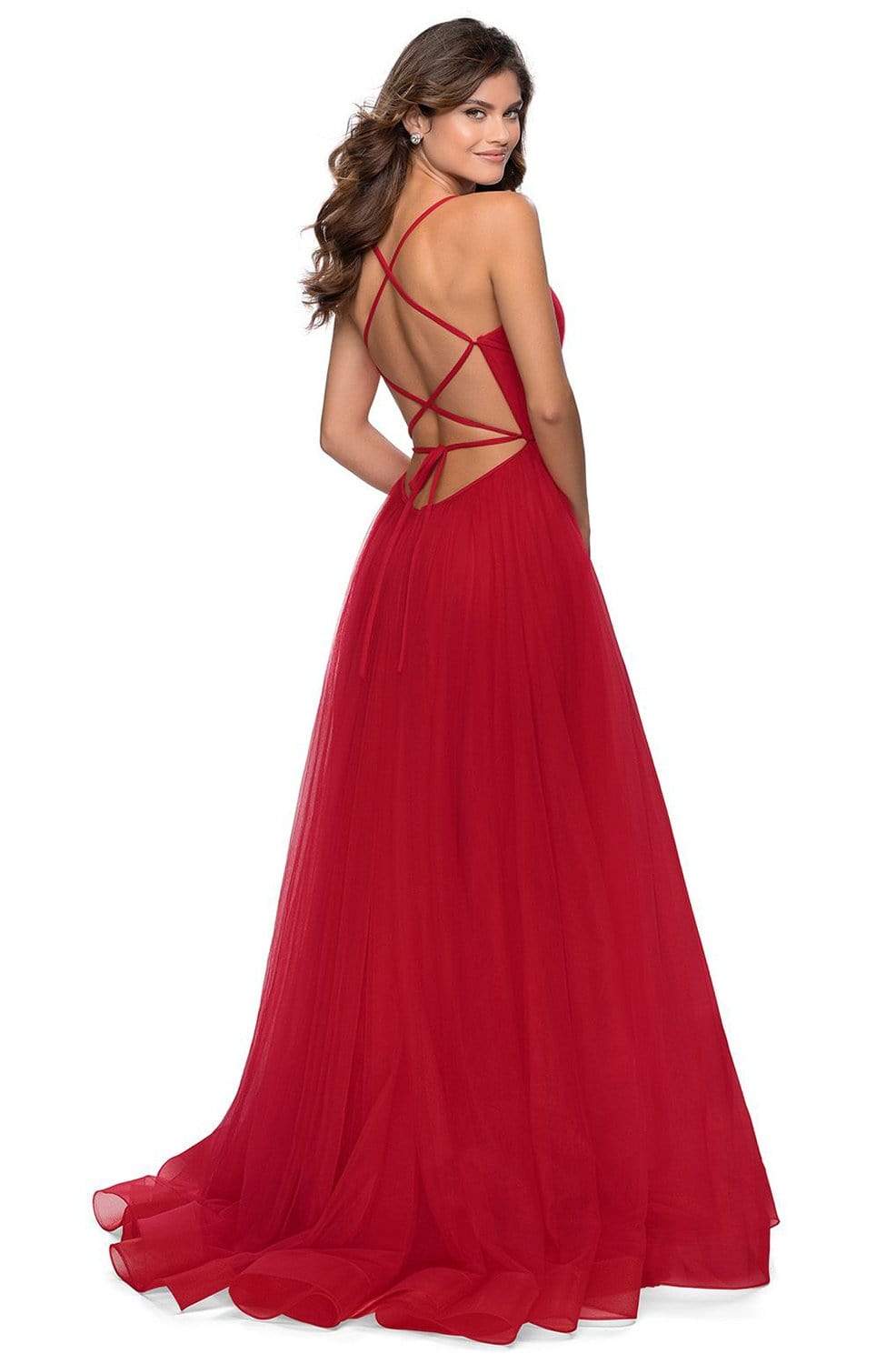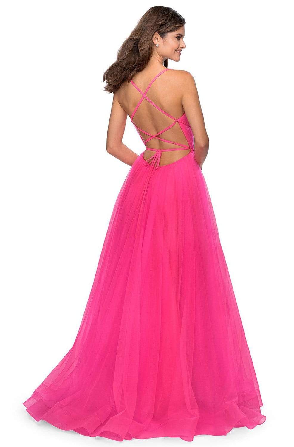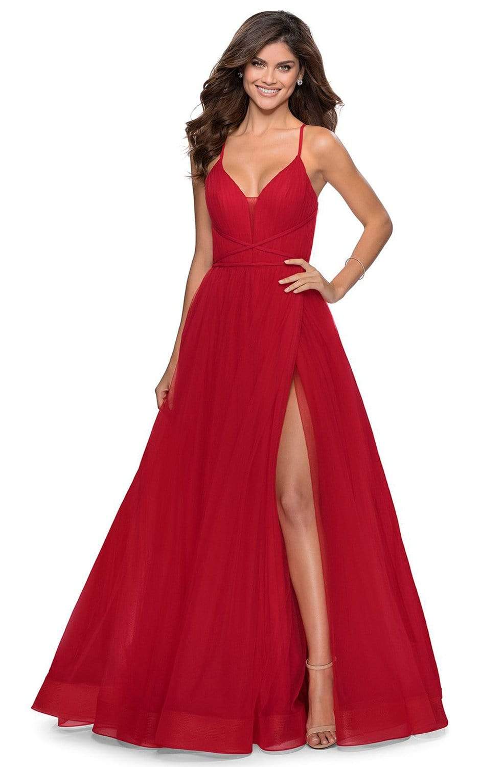 Get ready to mesmerize the opulently dressed crowd in this La Femme 28893 creation. Richly adorned with fine shirring along the bodice, this dress reveals a contoured v-neckline with a tonal illusion inset and shoulder straps. Graced with thin straps crisscrossing the bodice, a lace tie detail dominates the open back. The long A-line skirt layers in gossamer tulle while baring a sexy high slit. A frothy train trickles at the back to complete the look. Be an emblem of perfection and class in this La Femme masterpiece. Models are wearing the Neon Pink, Red and Royal Blue colors.