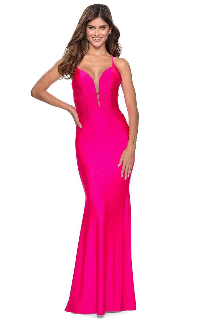 Make your grand entrance in this La Femme 28905. This sleeveless beauty features a plunging V neckline with mesh, front cut out, strappy open back and zipper closure. The sheath silhouette skirt falls elegantly in a sweep train. This La Femme creation is perfect for a standout style and flawless fit. Model is wearing Neon Pink and Neon Yellow colors.
