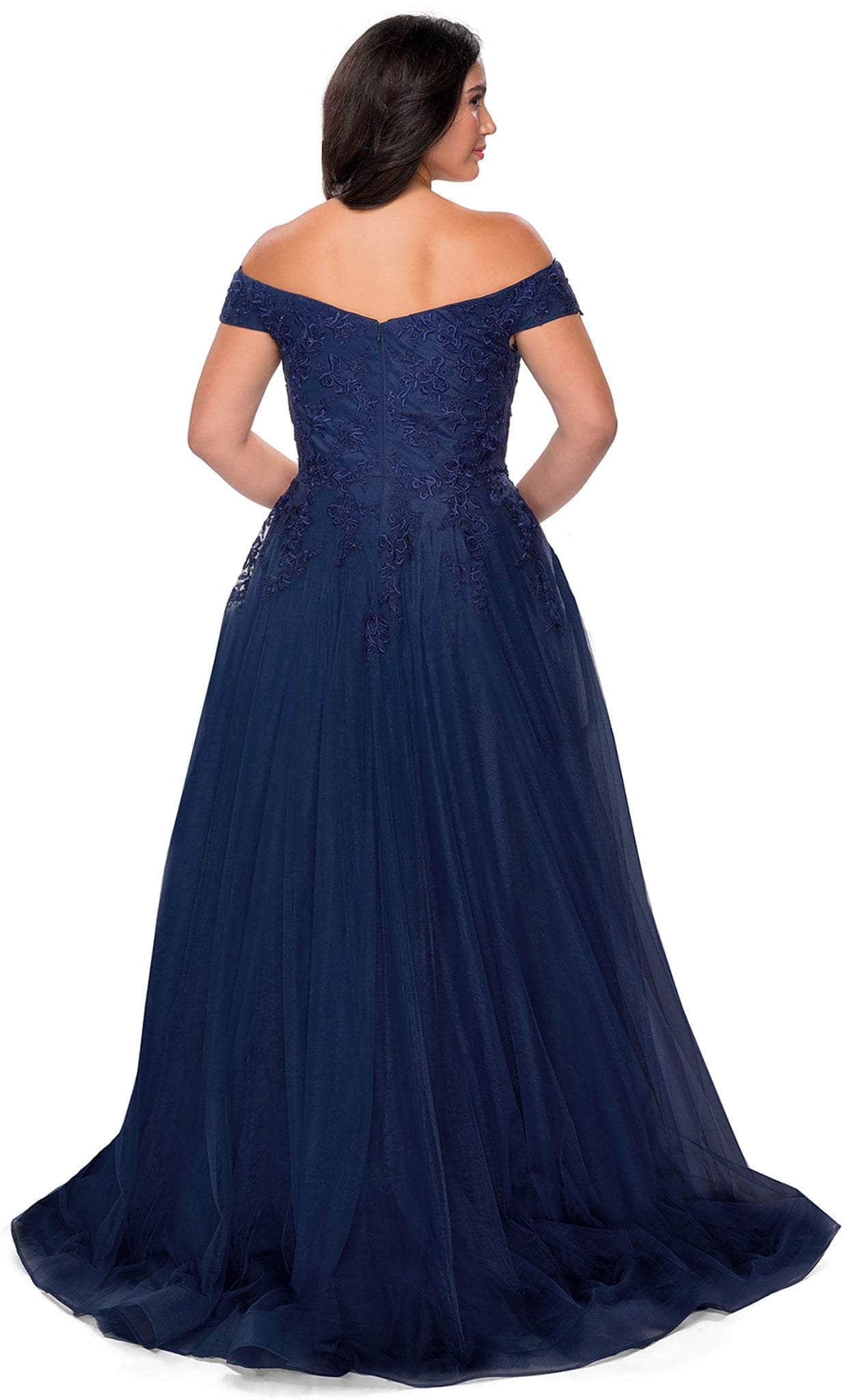 Revel in the feminine flair bestowed by this La Femme 28950 creation. Intricately embroidered with trailing florals and shimmering stones, this gown shows an off shoulder neckline with a wide v-notch design. The back flatters with an adorned open back. The tulle skirt shows off an A-line design and a high slit before ending in a sweep of train. Look and feel like a total stunner in this La Femme masterpiece.