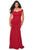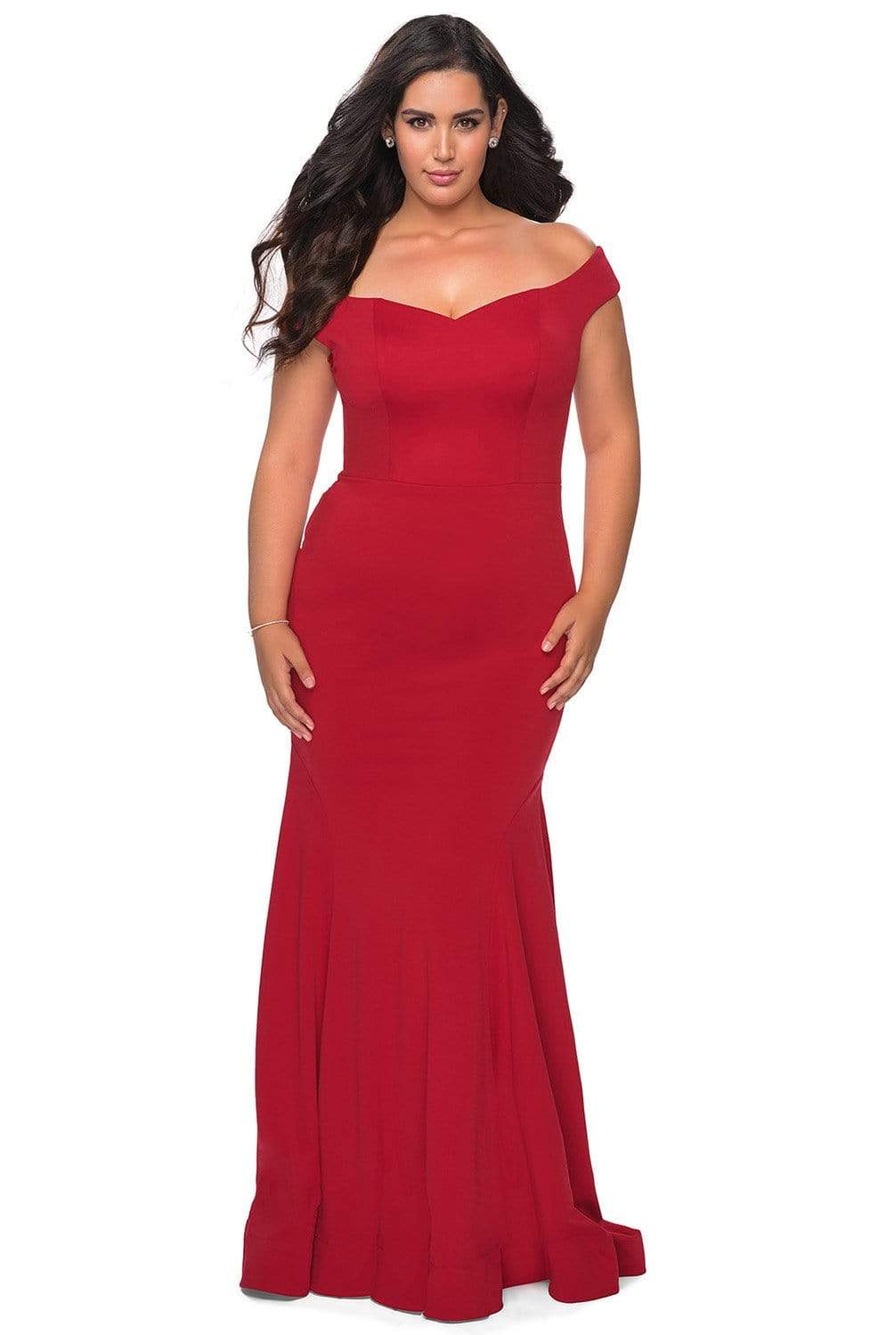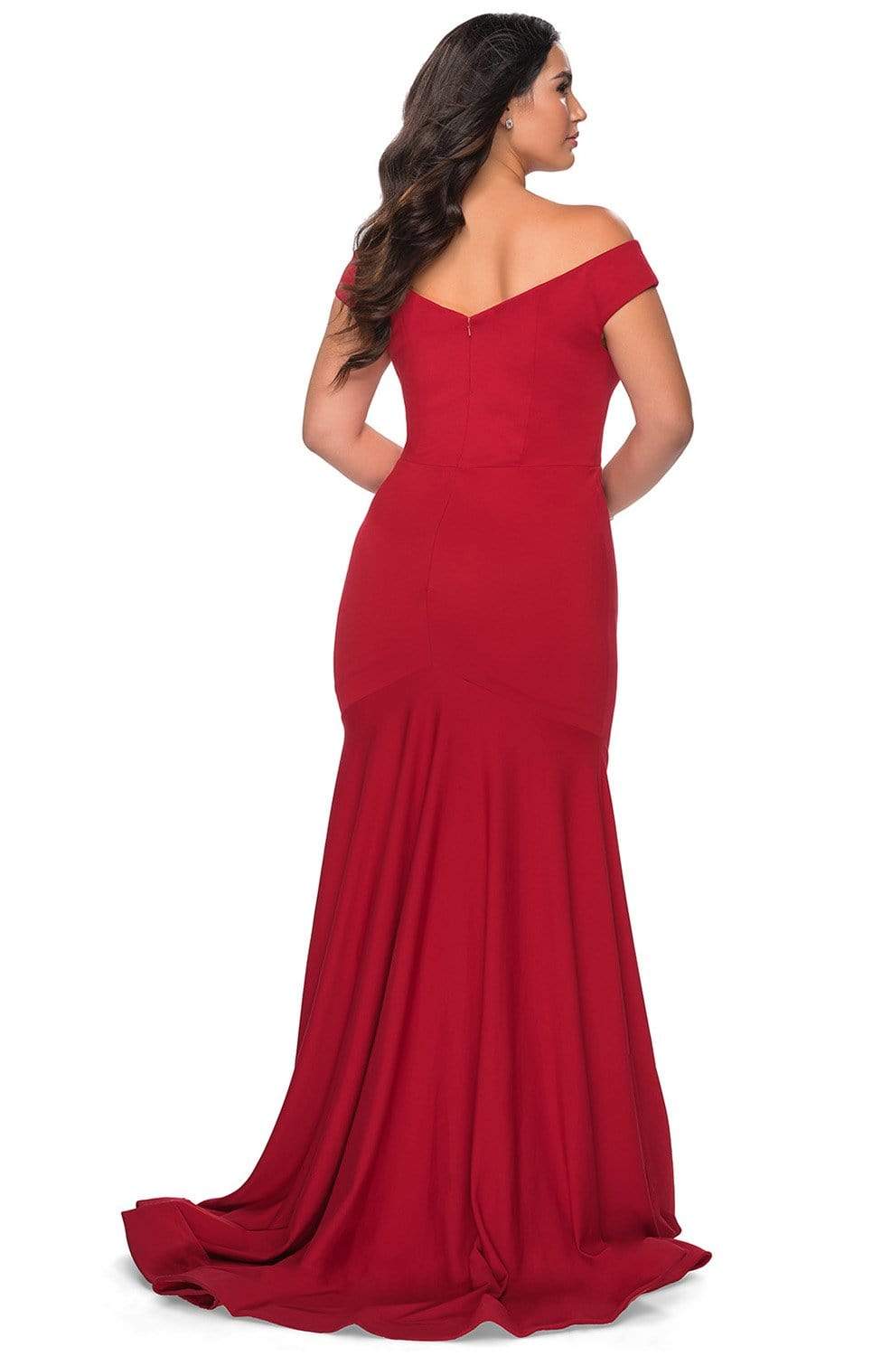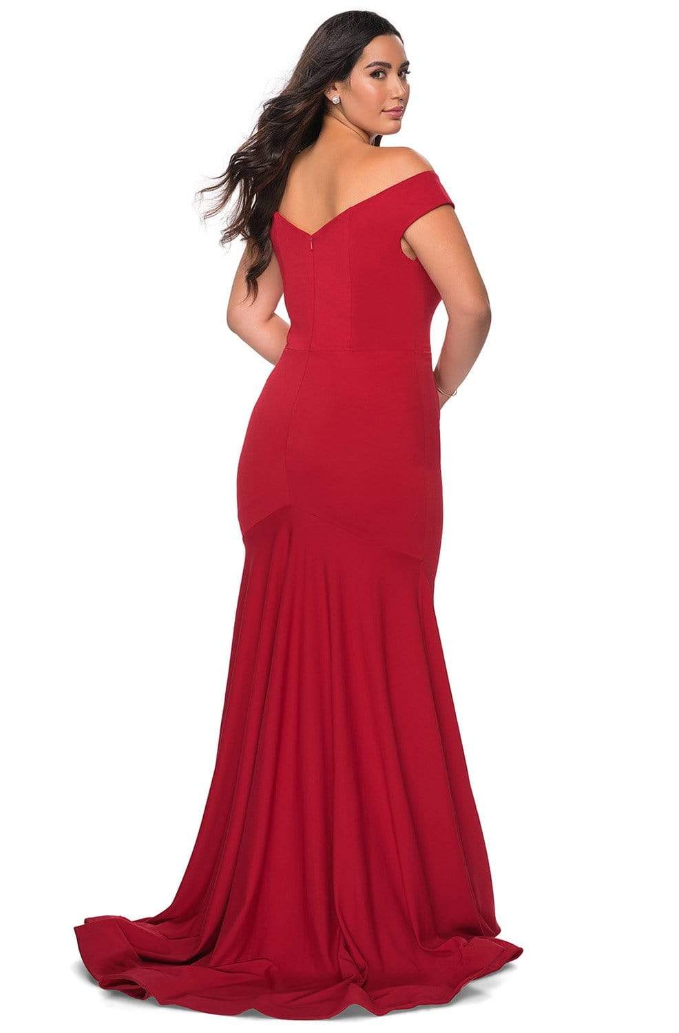 Display your beautiful side in this form-fitting La Femme 28963 evening dress. Made in jersey fabric, this creation showcases a princess seamed bodice with a flattering off-shoulder neckline, complemented with wide open V back. Soft pleats adorn the trumpet skirt and gorgeously cascades to the floor, completed with a sweep train. This evening gown by La Femme design is a red carpet knockout!