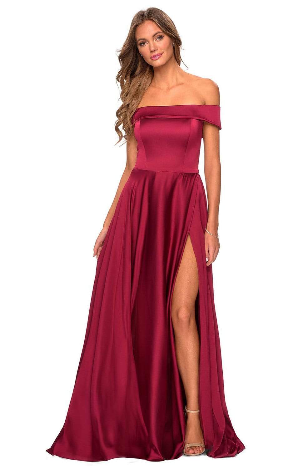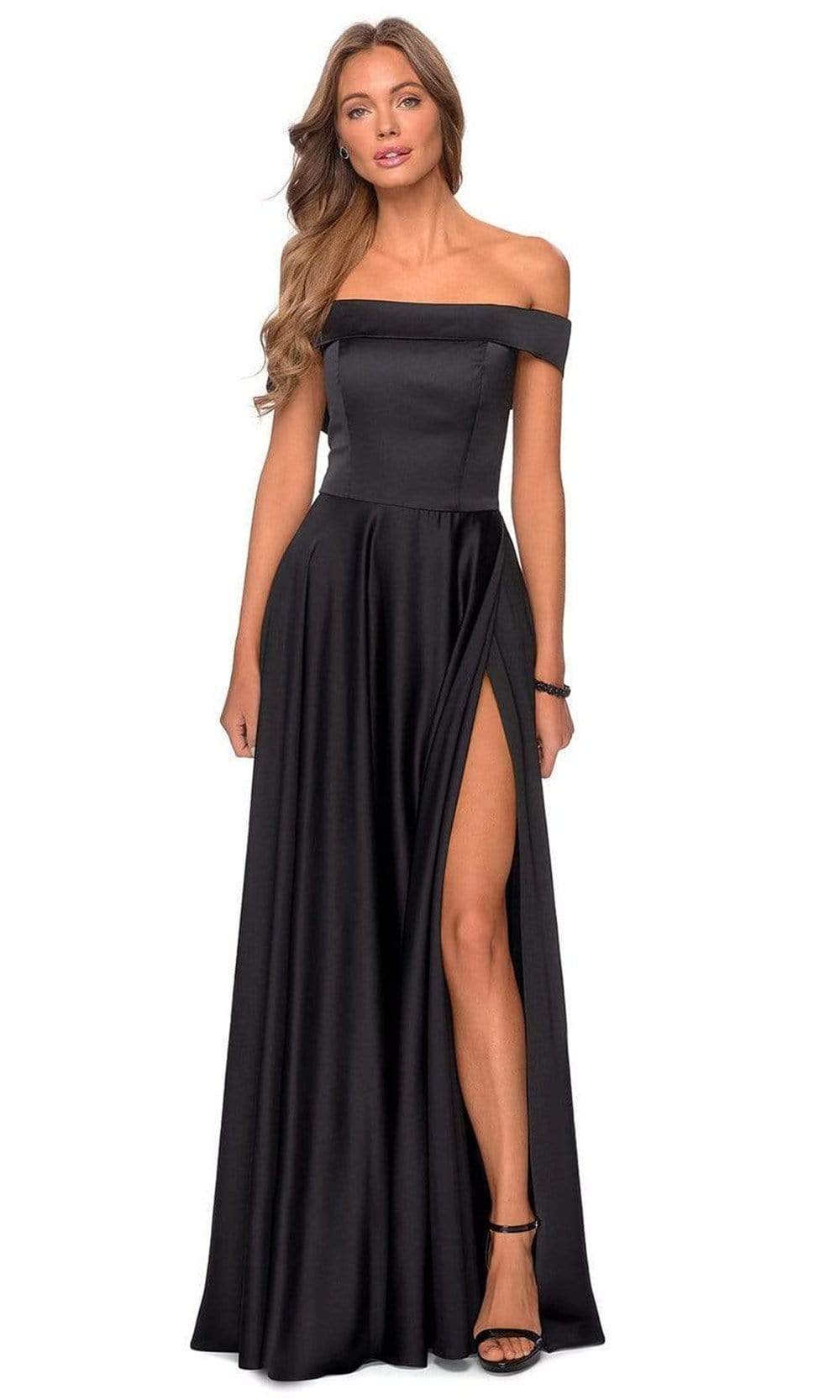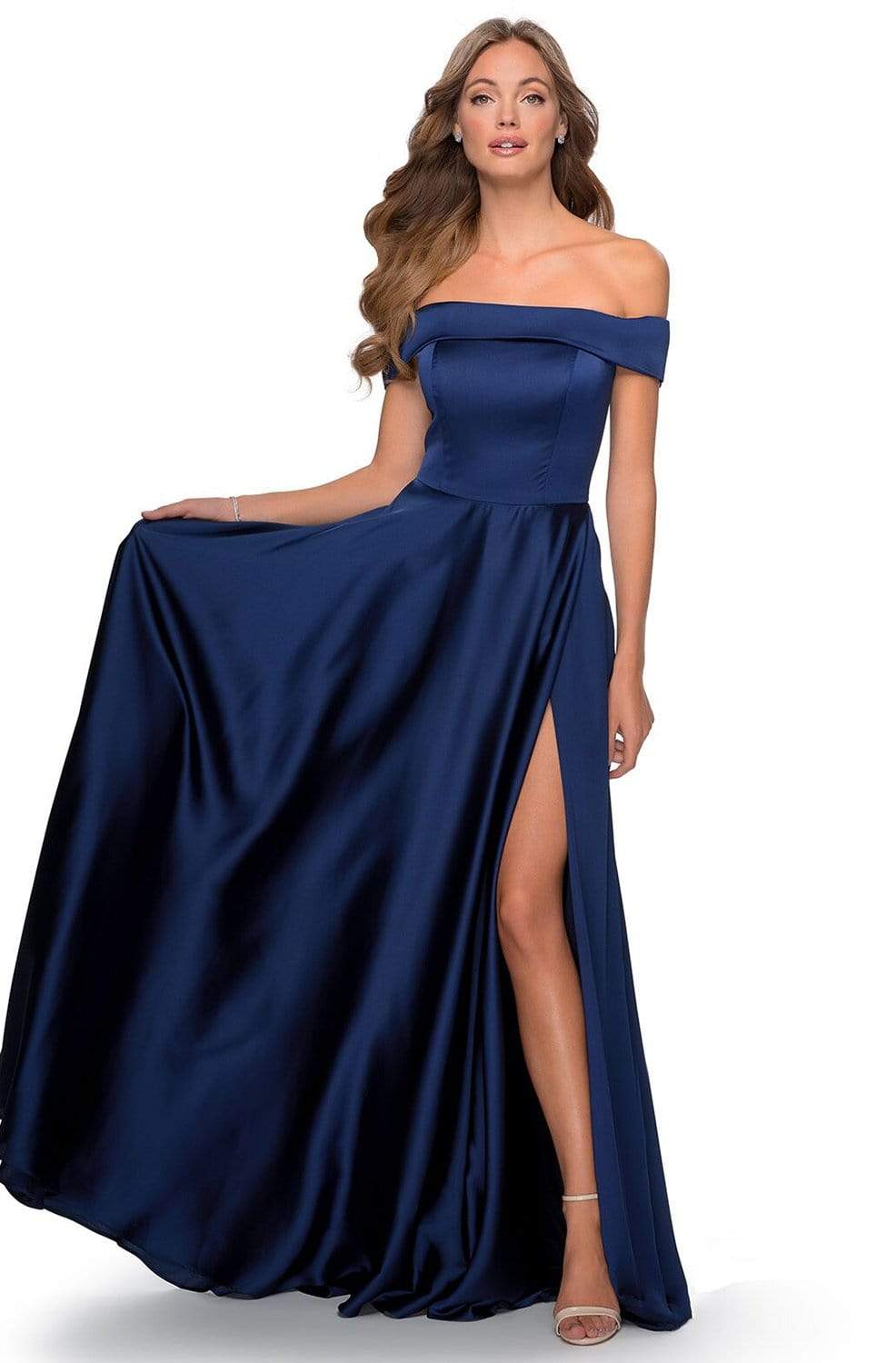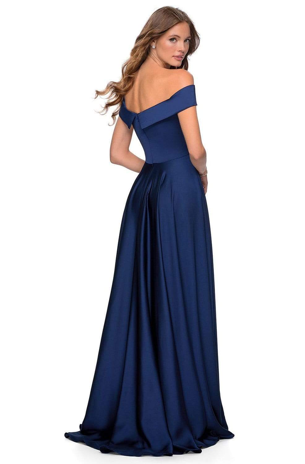 Look timeless in this fabulous dress by La Femme 28978. This satin dress features an off the shoulder neckline with a fitted bodice and a zipper closure. The A-line skirt is designed with pockets, a high slit, and a sweep train finish. Go for a timeless and sophisticated look wearing this La Femme dress. Find more prom dresses!