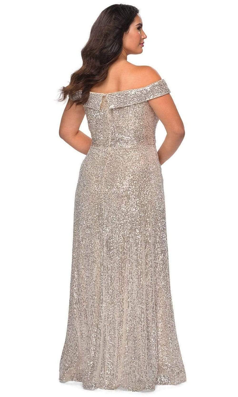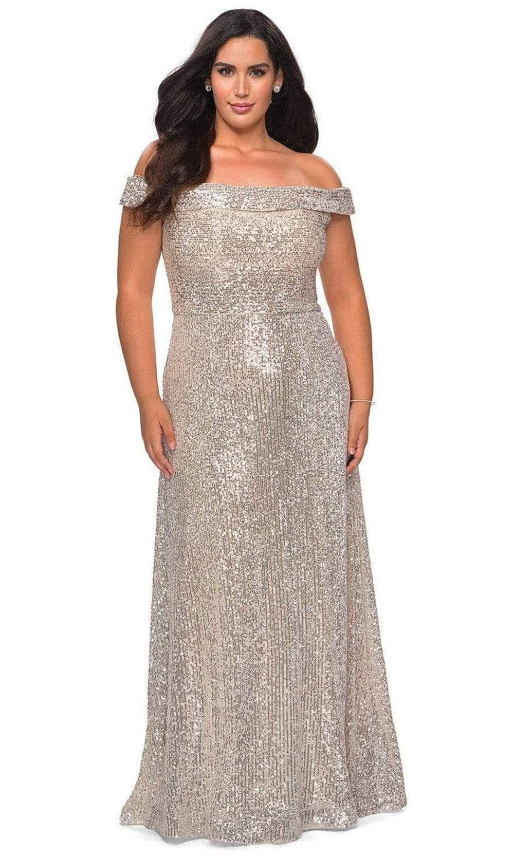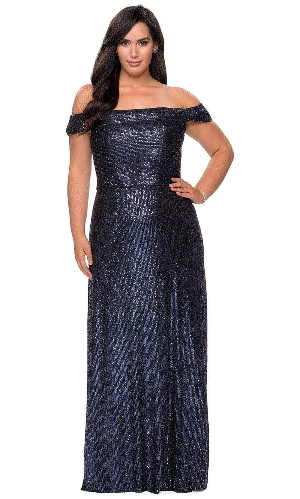 Make it your moment to stand out wearing this enthralling piece by La Femme 28988. The whole ensemble is designed in intricate sequin embellishments which provide the shimmering effect. An off-shoulder neckline with folded detail crowns the fitted bodice as the skirt displays an a-line silhouette which beautifully cascades to a full length hemline. Make them wow as you show up in this La Femme ensemble.