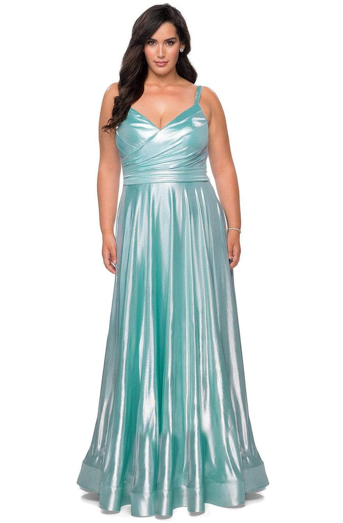 Light up the night in this eye-catching La Femme 28989 evening gown. This metallic jersey Grecian inspired prom dress showcases a ruched bodice crowned with a V neckline. A side slit accents the softly pleated a-line skirt and beautifully finishes with a sweep train. This La Femme dress parades the classy style.