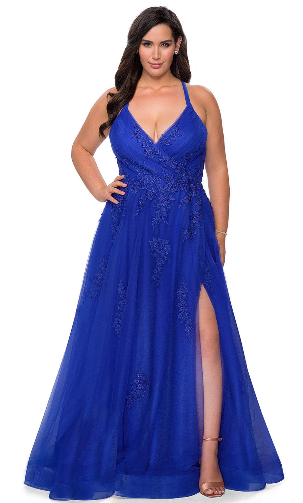 Dare to express yourself in this brazen dress from La Femme 29021. This tulle gown shows off a sleeveless, plunging V-neckline with fitted bodice styled with a criss cross back. The bodice is adorned with appliques and flourishes a full length A-line skirt with a sweep train finish. Beam with pride when you wear this radiant dress from La Femme.