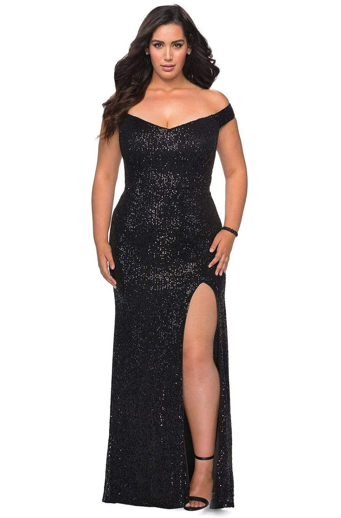 Lavish in the gorgeous appeal of this iridescently constructed La Femme 29023 creation. Flawlessly embellished with sequins while contouring along its silhouette, this gown flourishes an off shoulder neckline with a portrait notch design. Crafted with triple bands and a diamond cutout at the back, the sheath skirt opens with a sexy slit before dropping on the floor with a mini train. Tantalize everyone with the sheer lustrous of this La Femme masterpiece.