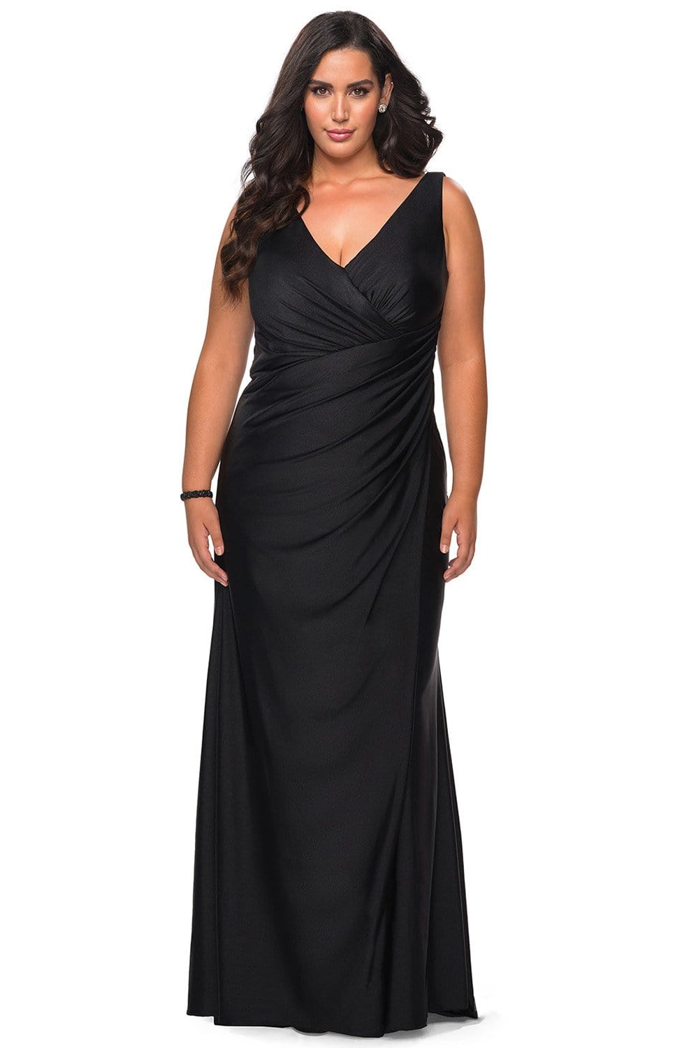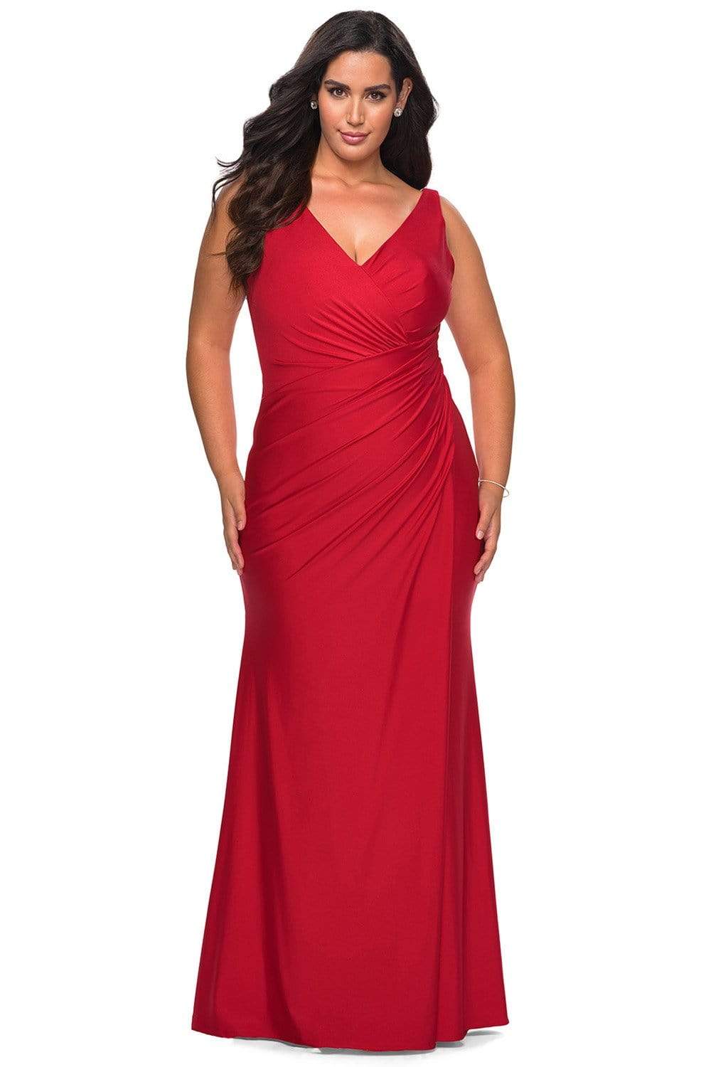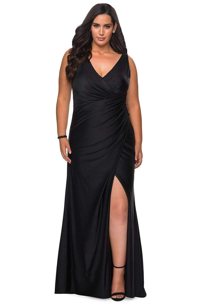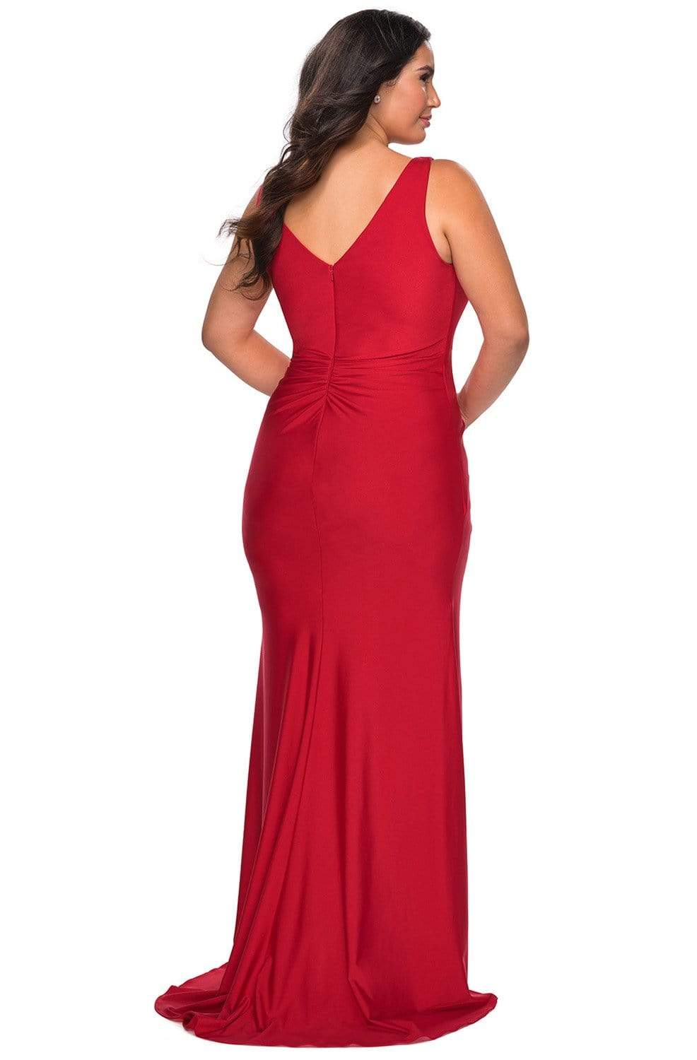 Start your night out right with a stylish dress from La Femme 29024. This jersey dress glams in a sleeveless, V-neckline with ruched bodice styled with a V-back and a zipper closure. The dress has a sheath skirt with a high slit and a sweep train. Claim that look of sophistication wearing this glamorous La Femme dress.