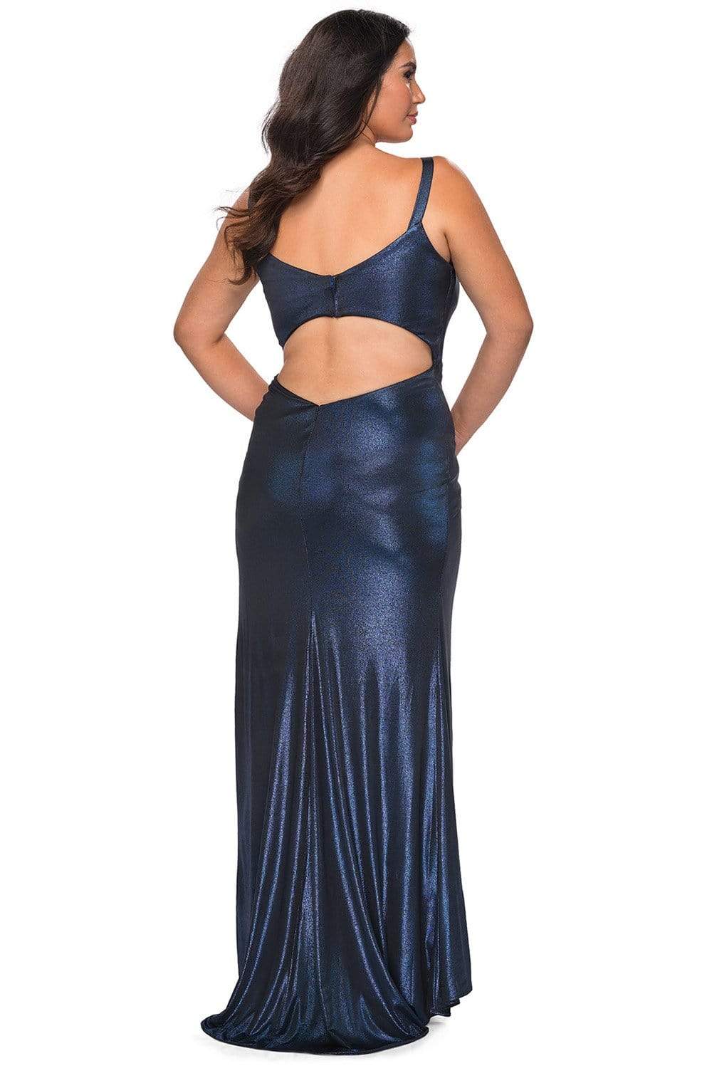Be ready to catch everyone's eyes in this design by La Femme 29053. This jersey dress fashions a sleeveless, plunging V-neckline with a wrapped bodice. The back is designed with a cutout and has a zipper closure. The skirt forms a fitted silhouette and is detailed with a high slit and a sweep train finish. This La Femme style is a sure stand out on your next evening social event.