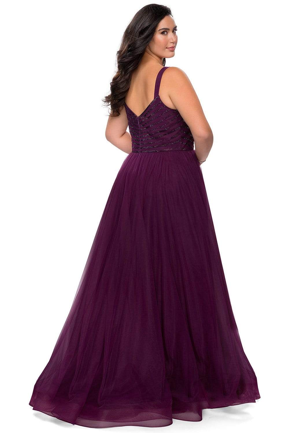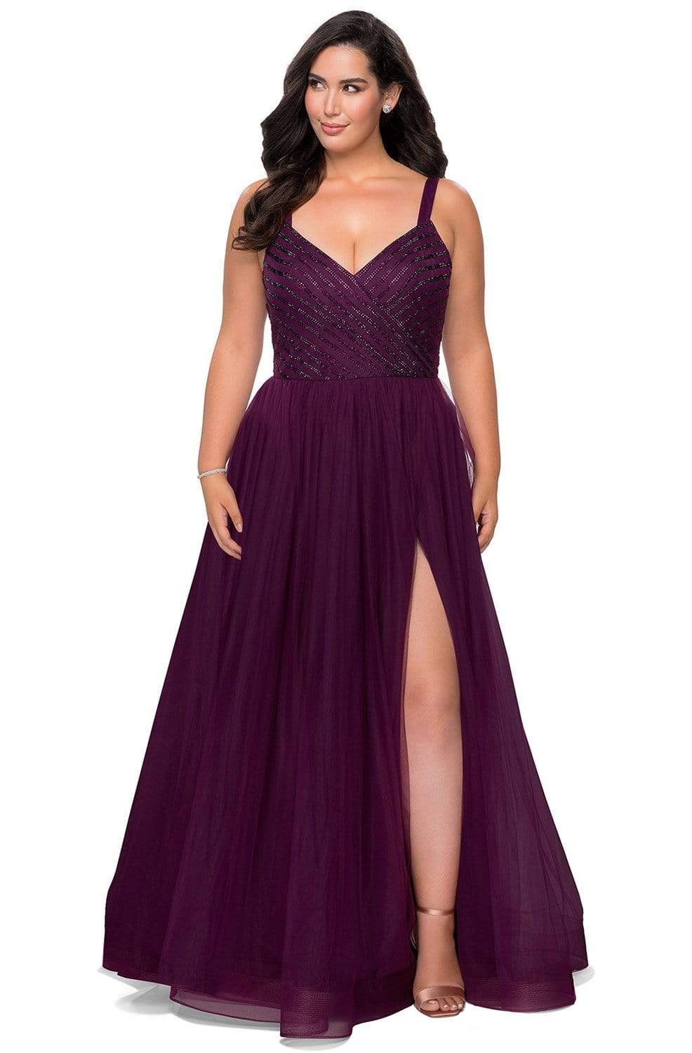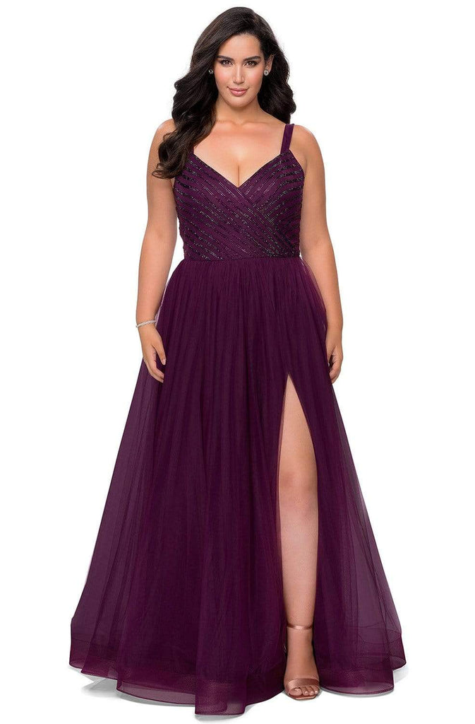 Exhibit exceptional style in this superb evening gown by La Femme 29060. This embellished gown makes a statement in a sleeveless, plunging V-neckline with shoulder straps. The fitted bodice is adorned with rhinestones while the back is tailored with a V-cut and has a zipper closure. The tulle skirt flourishes a ballgown silhouette and is detailed with a high leg slit and a horsehair hemline. Exude a charm that is meant to mesmerize the elite crowd in this gorgeously decadent La Femme look.