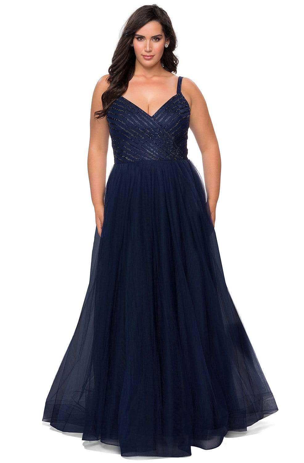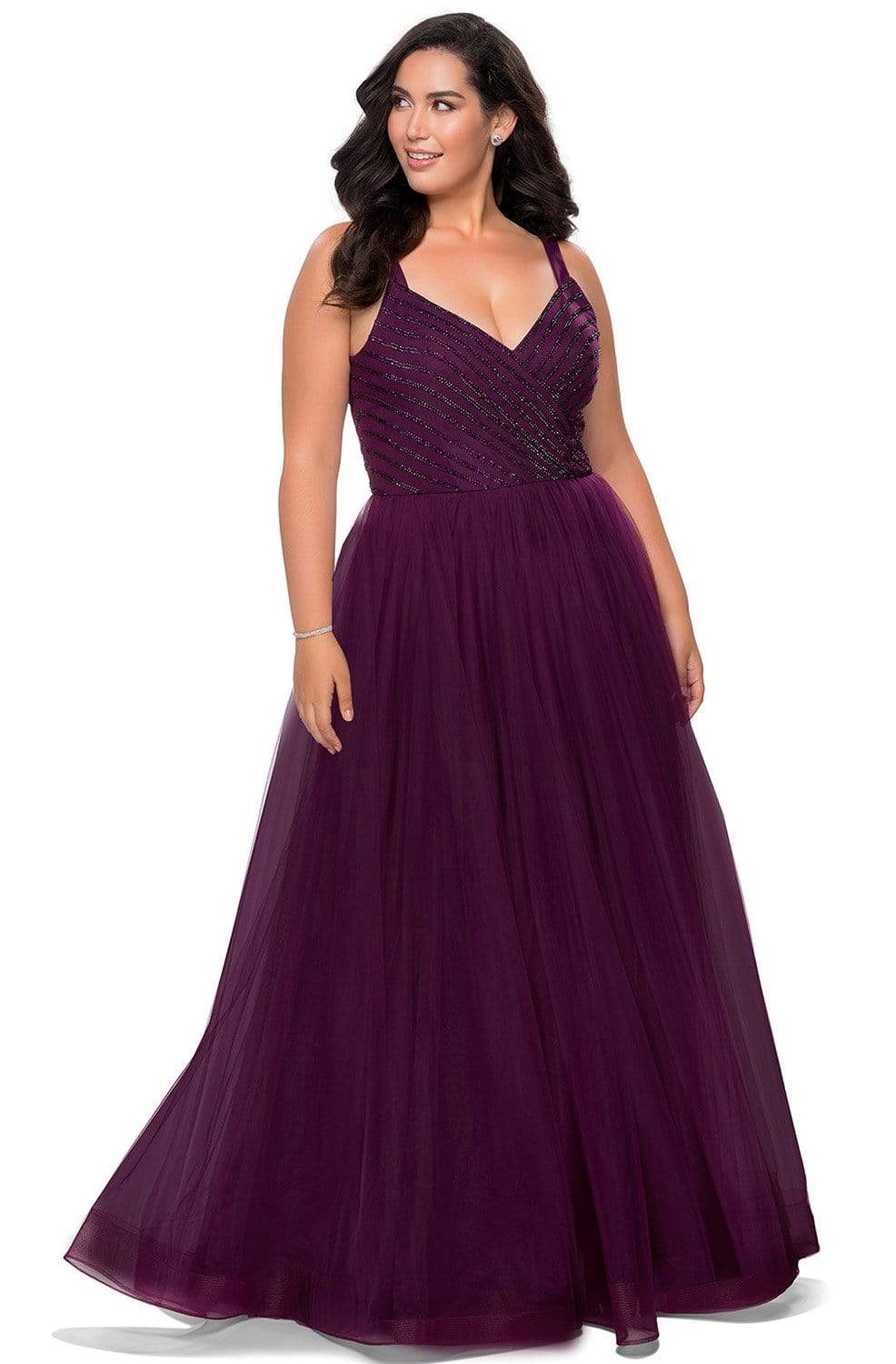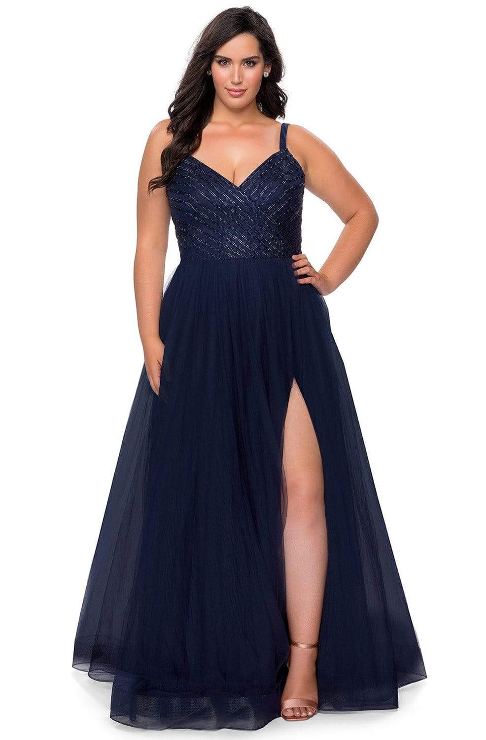 Exhibit exceptional style in this superb evening gown by La Femme 29060. This embellished gown makes a statement in a sleeveless, plunging V-neckline with shoulder straps. The fitted bodice is adorned with rhinestones while the back is tailored with a V-cut and has a zipper closure. The tulle skirt flourishes a ballgown silhouette and is detailed with a high leg slit and a horsehair hemline. Exude a charm that is meant to mesmerize the elite crowd in this gorgeously decadent La Femme look.
