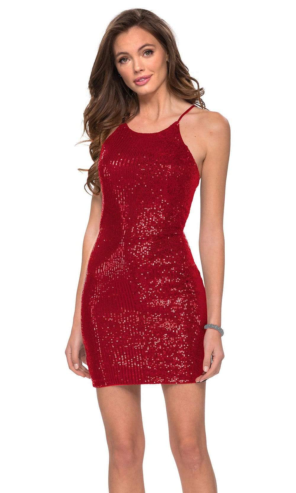 Steal the show in this dazzling look from La Femme 29276. This sequined cocktail dress glams in a sleeveless, halter neckline with thin straps. The fitted bodice has a lace up back and a back cutout. The skirt highlights your figure with its mid-thigh, fitted silhouette. Stand out in every occasion with this daring creation by La Femme.